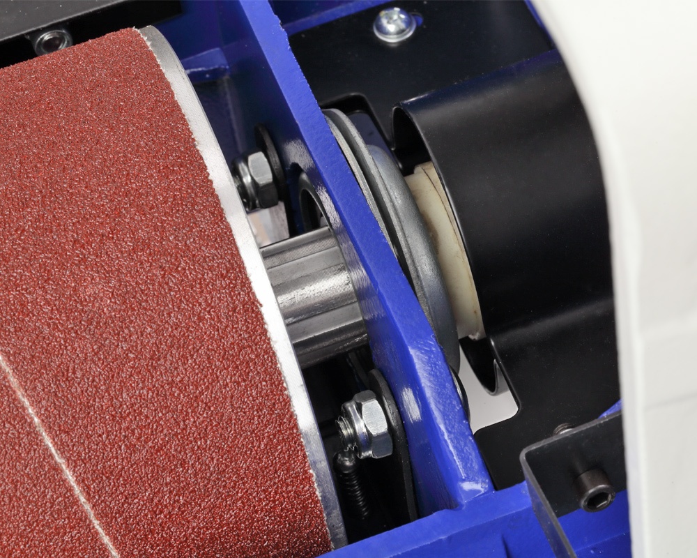 Станок оснащен мощным асинхронным двигателем (1500 Вт), который поддерживает стабильные 1440 об/мин на шлифовальном барабане. Сам барабан (длина 415 мм, диаметр 132 мм) обеспечивает равномерный прижим абразивной ленты по всей ширине контакта.