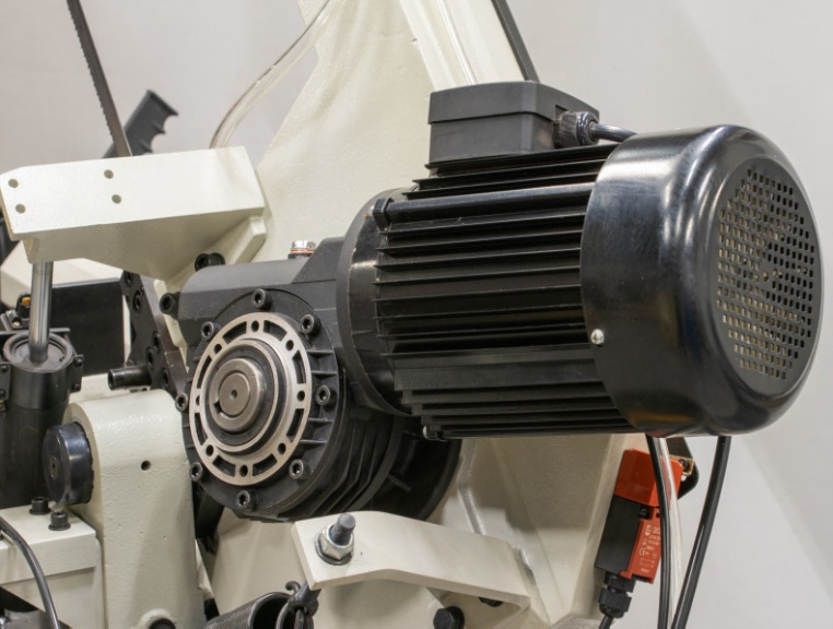 - Натяжение полотна производится натяжным шкивом, привод которого осуществляется через редуктор от основного приводного шкива. Рама опускается под собственным весом, а встроенный регулируемый гидроцилиндр автоматически изменяет скорость хода в зависимости от формы и размеров заготовки, обеспечивая оптимальные условия пиления.