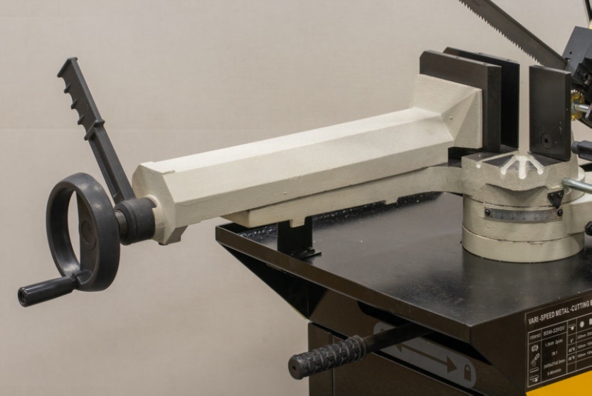 - Модель оснащена быстро регулируемыми тисками для резки под углом — при этом поворачивается рама, а не сама заготовка. Система быстрого отвода подвижной губки позволяет ускорить замену деталей: зажим освобождается без вращения маховика.