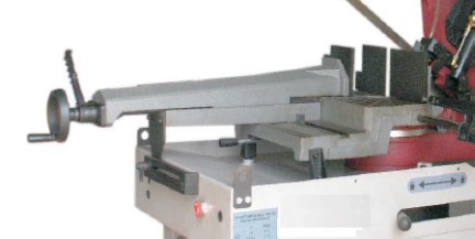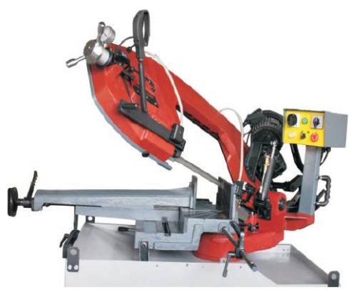 - Натяжение полотна производится натяжным шкивом, привод которого осуществляется через редуктор от основного приводного шкива. Рама опускается под собственным весом, а встроенный регулируемый гидроцилиндр автоматически изменяет скорость хода в зависимости от формы и размеров заготовки, обеспечивая оптимальные условия пиления.
