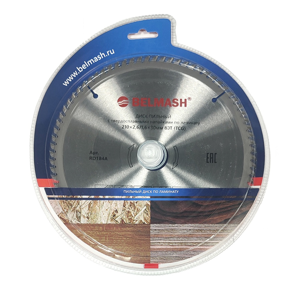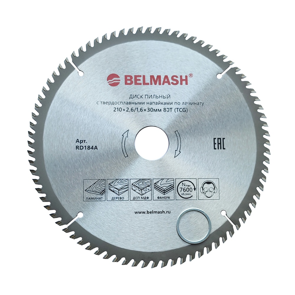Диск пильный по ламинату BELMASH 210x2,6/1,6x30 80T с твердосплавными напайками для торцовочных пил и другого оборудования, подходящего по техническим характеристикам.