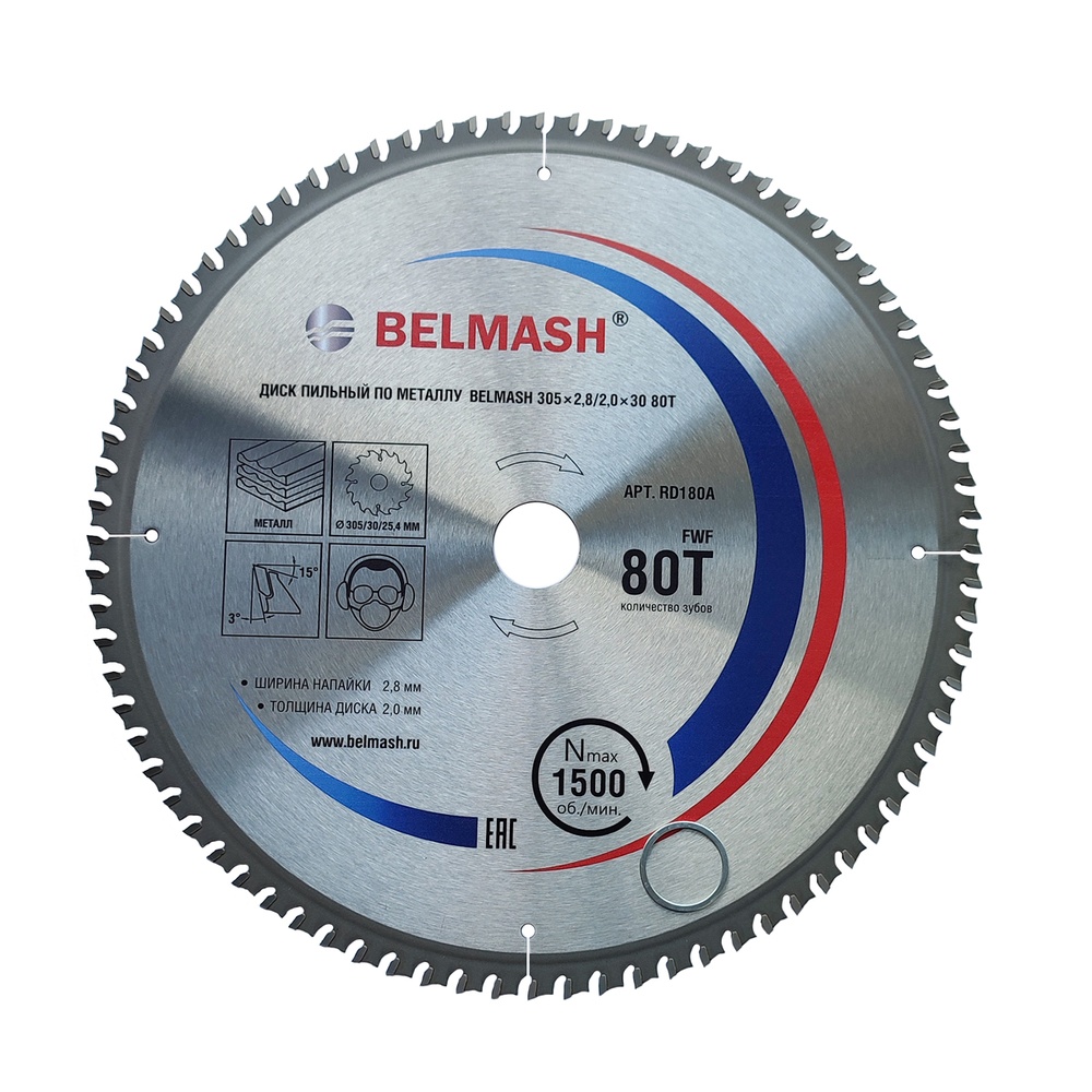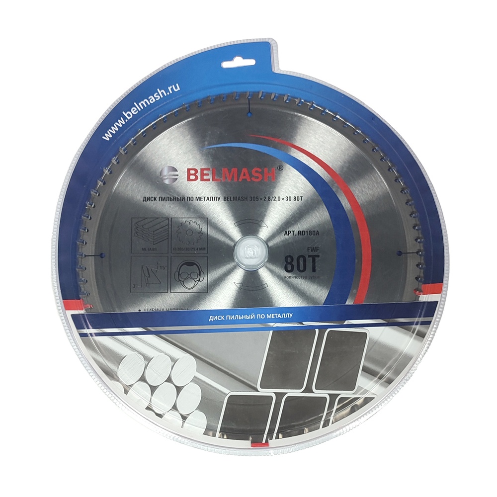 Диск пильный BELMASH 305x2,8/2,0x30 80T применяется для распила тонких листов, профилей и прутков небольших диаметров из стали (до 100 мм).