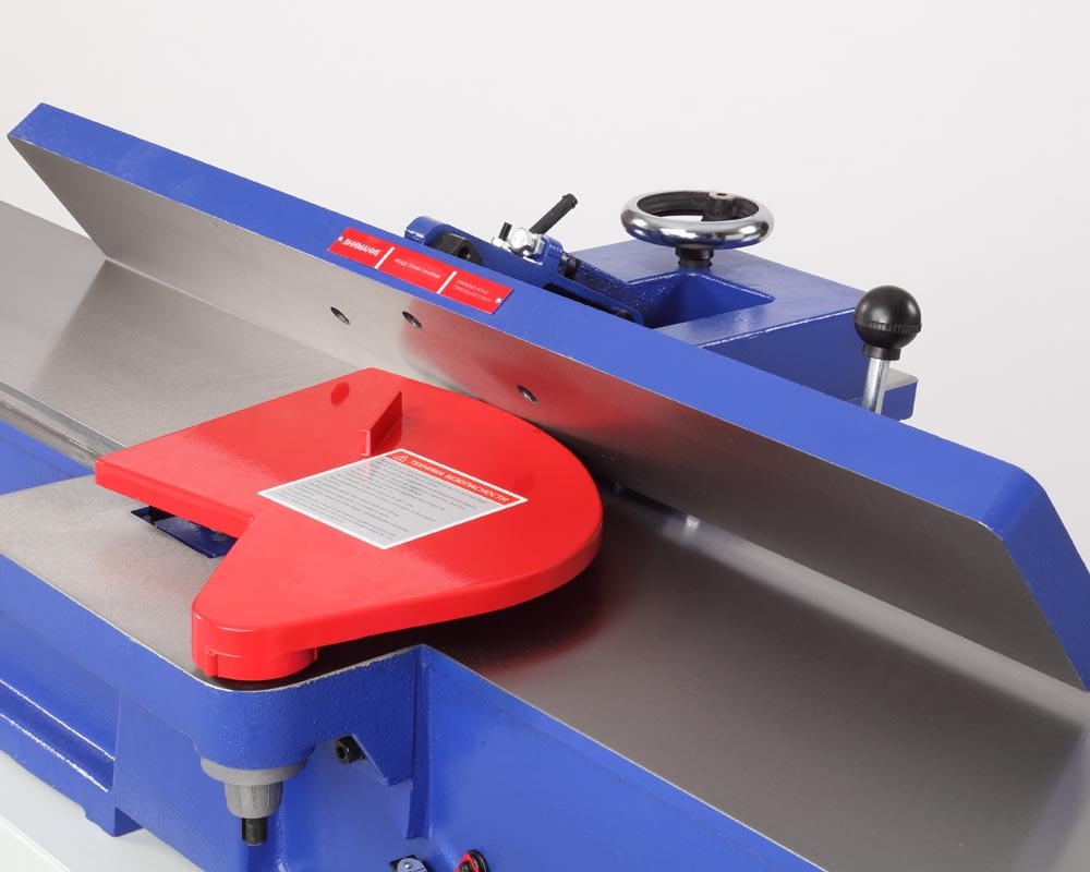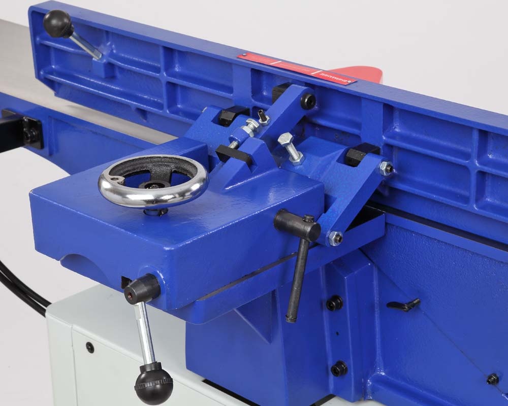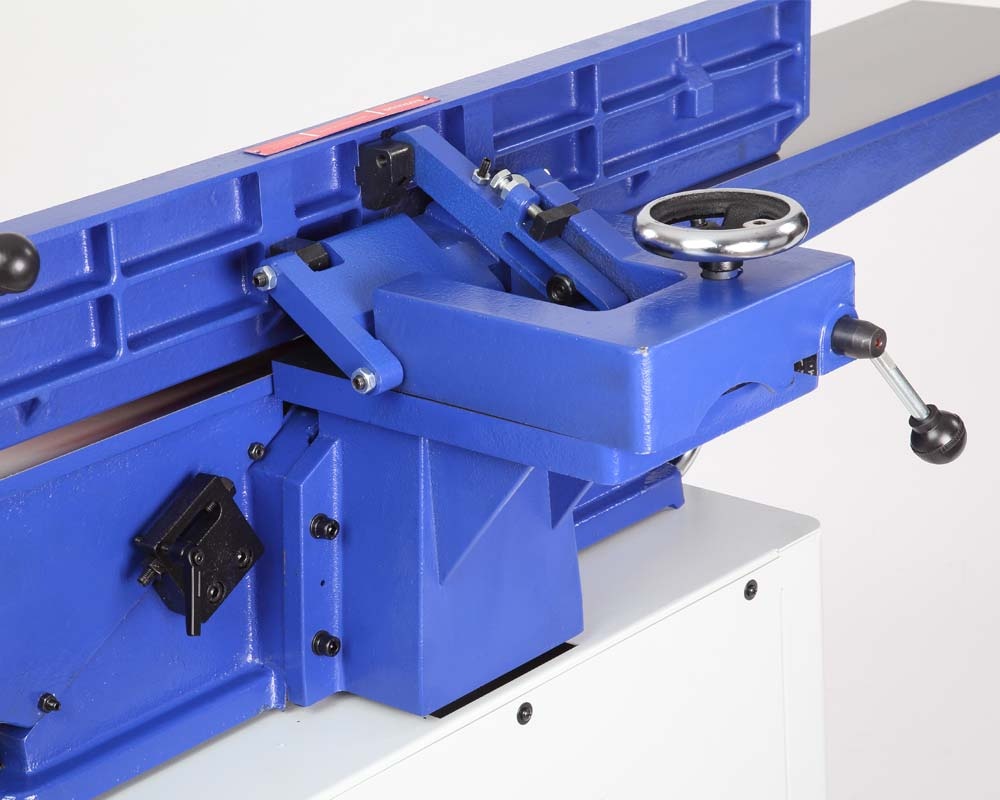 Прецизионная настройка столов: Перемещение подающего и приемного столов осуществляется по направляющим типа «ласточкин хвост». Регулировка глубины строгания производится массивными маховиками.