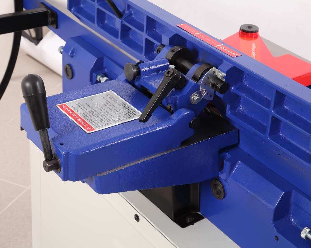 Массивный чугунный упор: Параллельный упор размером 910×123 мм перемещается по скользящему механизму, обеспечивая быструю перенастройку под ширину заготовки. Упор наклоняется на 45° в обе стороны.