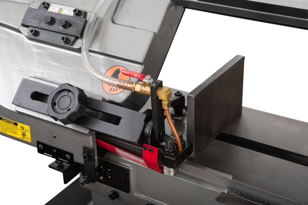- В нижней части рамы расположена щётка для очистки полотна от стружки, а в зону реза подаётся охлаждающая жидкость (СОЖ), что способствует чистоте и точности распила. Регулировка натяжения полотна выполняется вручную с помощью маховика.