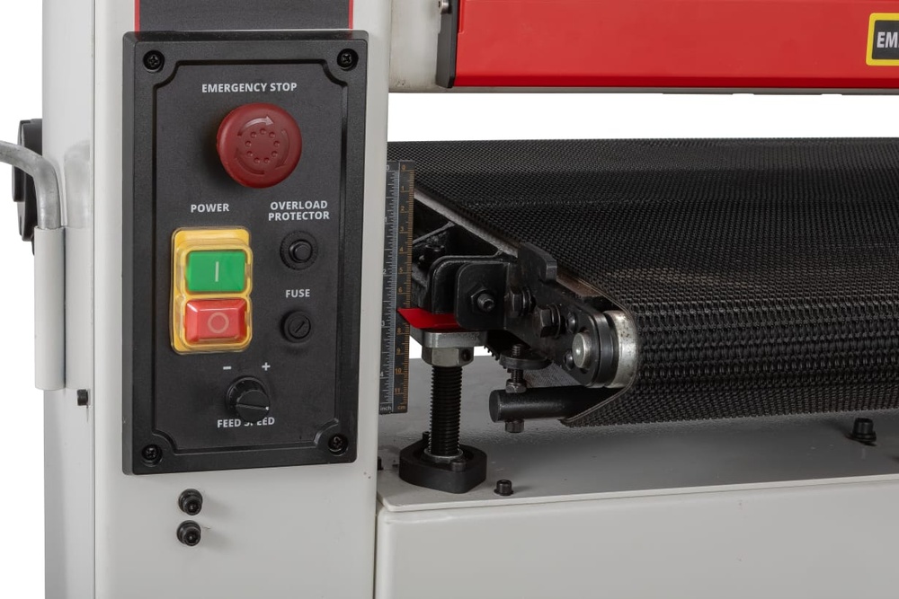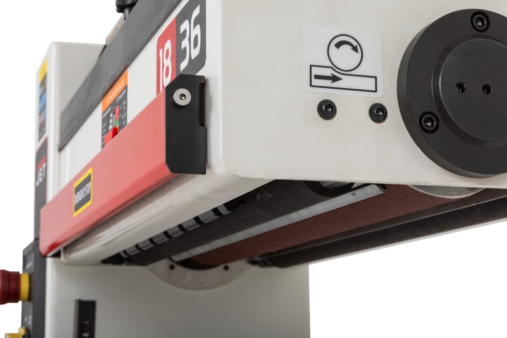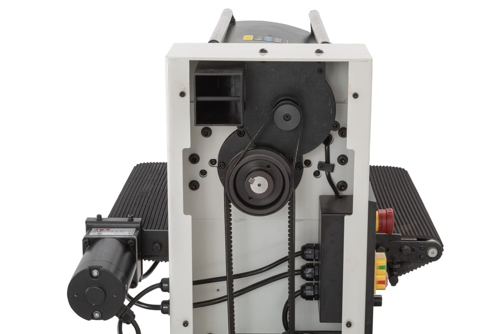 - Система подачи выполнена на высоком уровне: увеличенные резиновые ролики надёжно фиксируют заготовку и равномерно проводят её через станок. Транспортер сделан из прочного полимерно-тканого материала, что увеличивает его срок службы и обеспечивает бережную обработку заготовок. При необходимости ленту можно заменить на абразивную. Плавная регулировка скорости движения транспортера (0,5–4 м/мин) позволяет точно подбирать интенсивность шлифования.