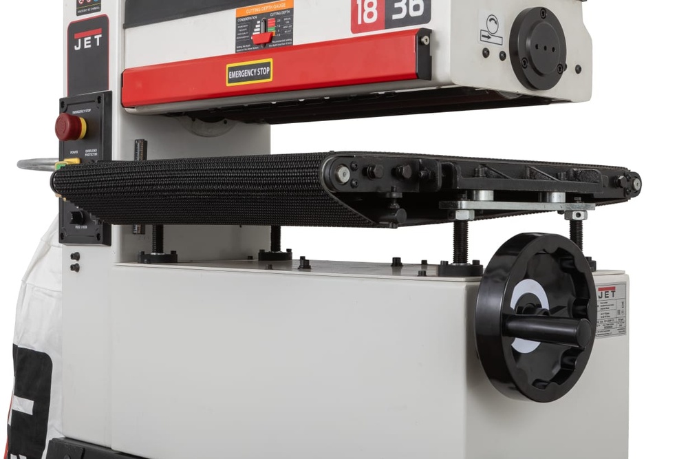 - Регулировка высоты происходит подъёмом стола – аналогично рейсмусовым станкам JET. Система основана на четырёх колоннах с цепным приводом, что исключает люфты и обеспечивает точность. Фиксация стола выполняется зажимом внутри маховика. Благодаря этому верхняя часть станка остаётся свободной и используется как рабочая поверхность с интегрированными роликами для подачи заготовок.