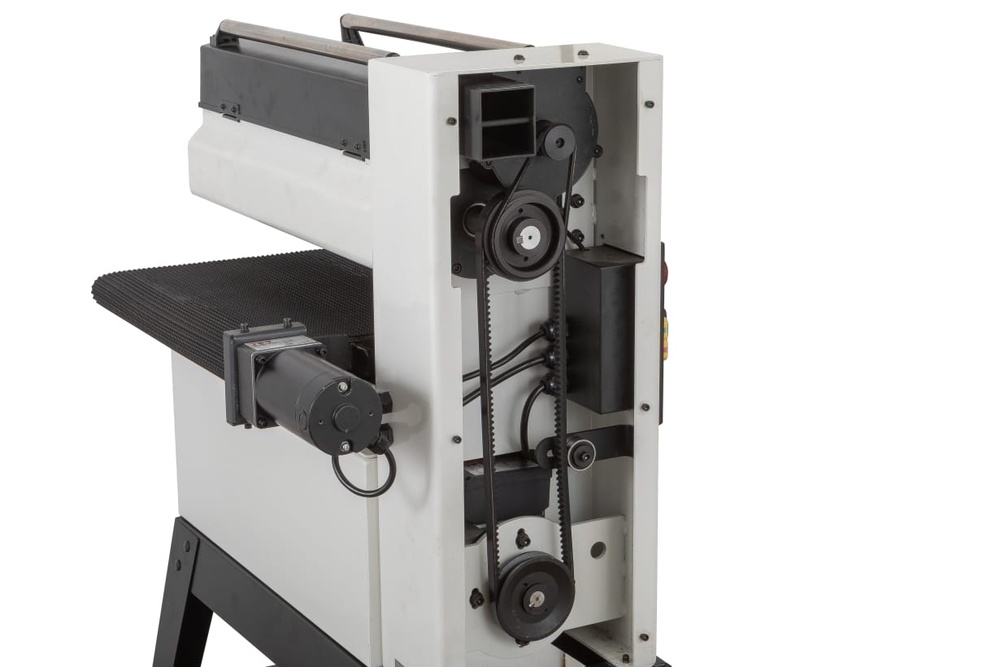 - После запуска двигателя ремённая передача приводит во вращение барабан с закреплённой абразивной лентой. Второй привод отвечает за работу транспортера, перемещающего заготовку через рабочую зону. При прохождении детали через барабанный узел материал снимается равномерно, достигается нужная толщина или качество поверхности.