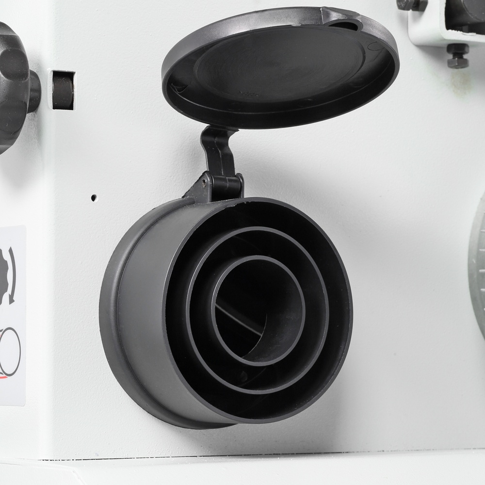 Чистота в зоне реза: Под рабочим столом предусмотрен выдвижной ящик для сбора опилок. Для подключения вытяжки установлен универсальный трехступенчатый патрубок (Ø 49/74/79 мм).