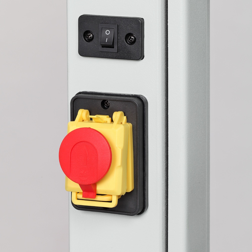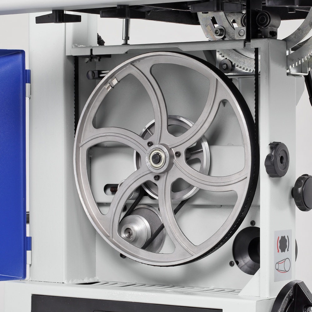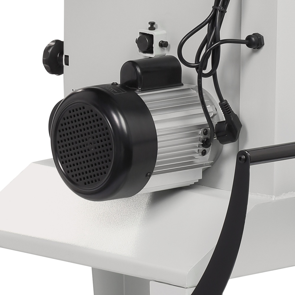 Станок оснащен выносливым асинхронным двигателем мощностью 800 Вт с системой воздушного охлаждения (режим работы S1). Питание осуществляется от стандартной сети 230 В. Для работы с материалами разной плотности предусмотрены две скорости полотна (370 и 800 м/мин), переключение которых позволяет достичь идеального баланса производительности и чистоты обработки.