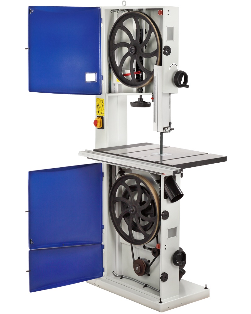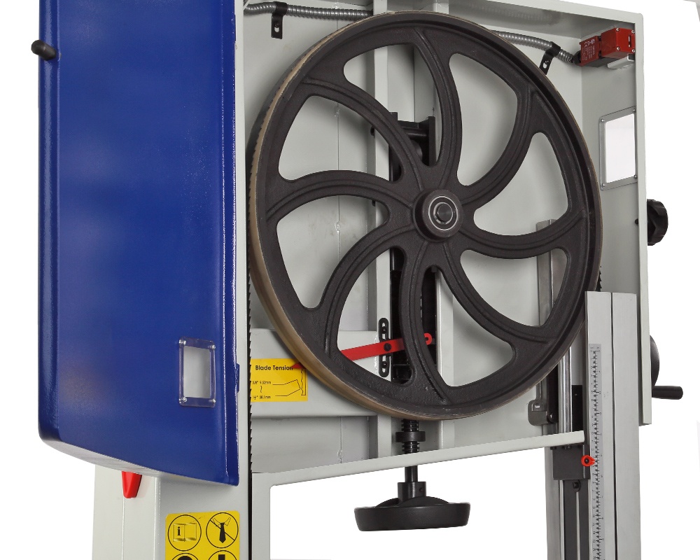 Чугунные маховики: Шкивы диаметром 420 мм обеспечивают высокую инерционность и плавность хода пильного полотна.