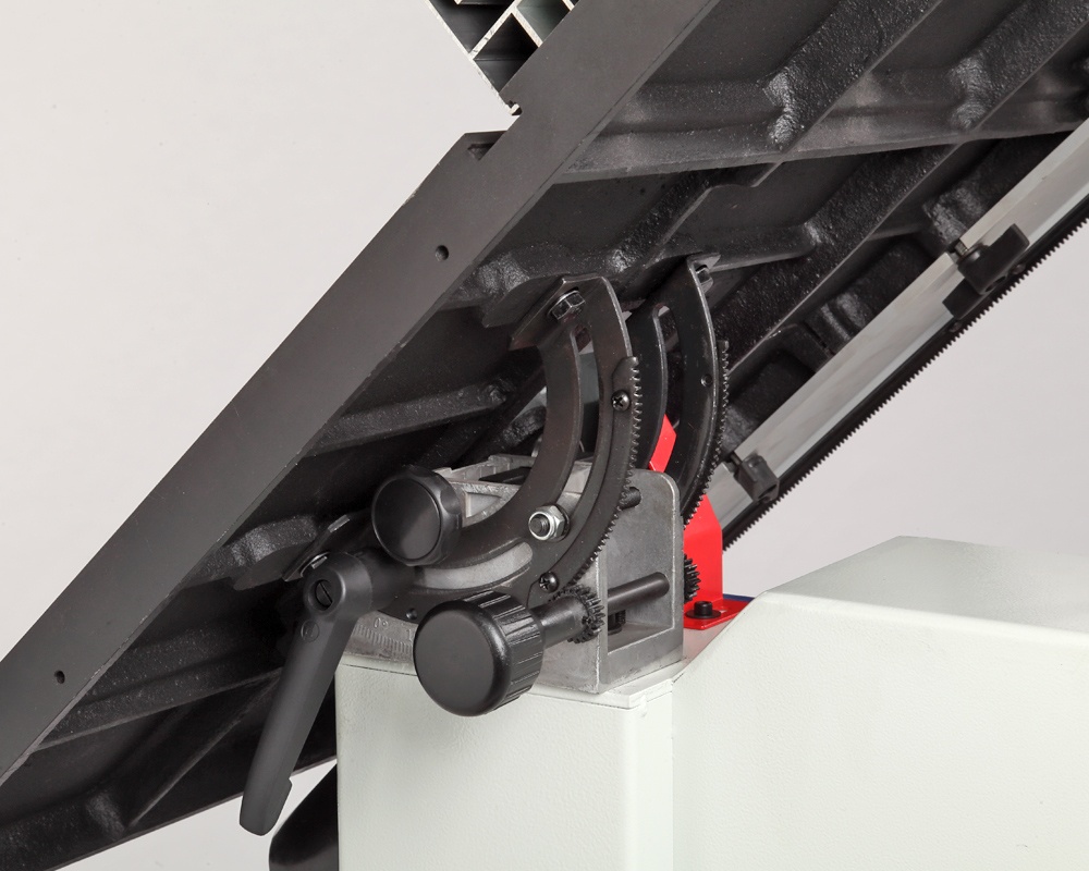 Чугунное основание: Основной стол выполнен из массивного литого чугуна, который отлично гасит вибрации. Угол наклона регулируется в диапазоне от -5° до +45°.