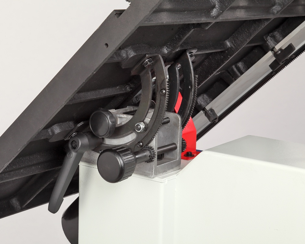 Чугунный рабочий стол: Массивное основание эффективно гасит вибрации. Угол наклона регулируется в диапазоне от -5° до +45°, что расширяет возможности при изготовлении сложных мебельных элементов.
