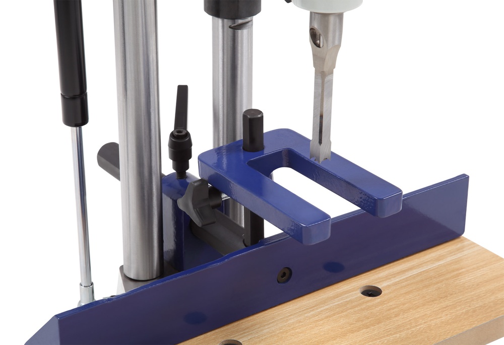 Для облегчения работы станок оборудован газовым амортизатором (пружиной), который автоматически возвращает рабочий узел в верхнее положение. Наличие ограничителя глубины позволяет выполнять глухие пазы с высокой точностью повторения, что критически важно для серийного изготовления мебели.