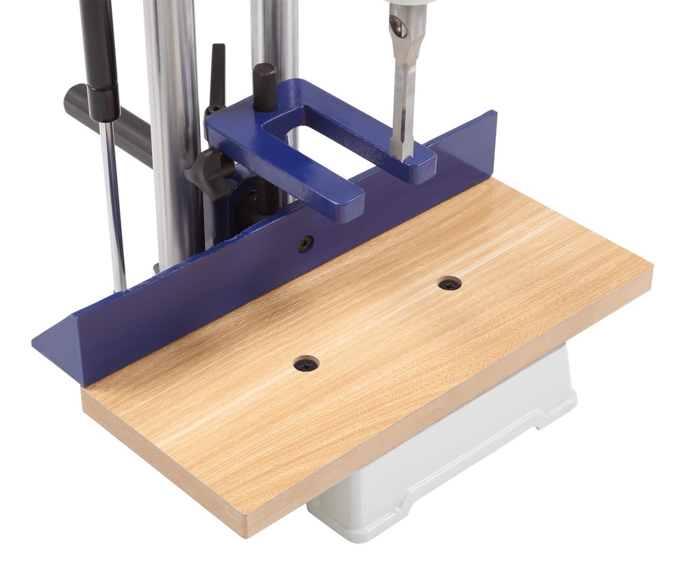 Стандартно станок оснащен столом из МДФ, который обеспечивает бережную поддержку заготовки. При необходимости выполнения специфических задач столешницу можно демонтировать — это открывает доступ к чугунному основанию с пазами для установки станочных тисков, превращая модель в еще более универсальный инструмент.
