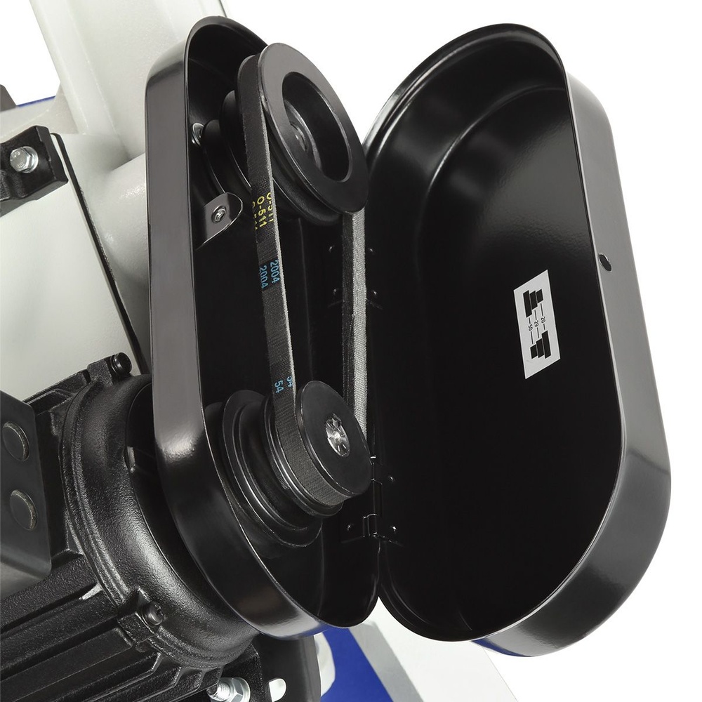 Трехскоростной режим: Изменение скорости движения полотна (20/29/50 м/мин) осуществляется путем переброски клинового ремня, что позволяет эффективно обрабатывать как нержавеющую сталь, так и цветные сплавы.