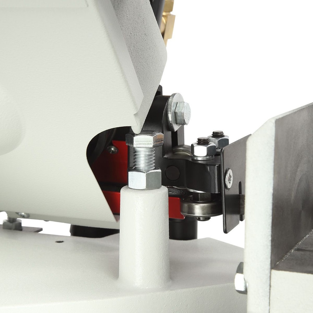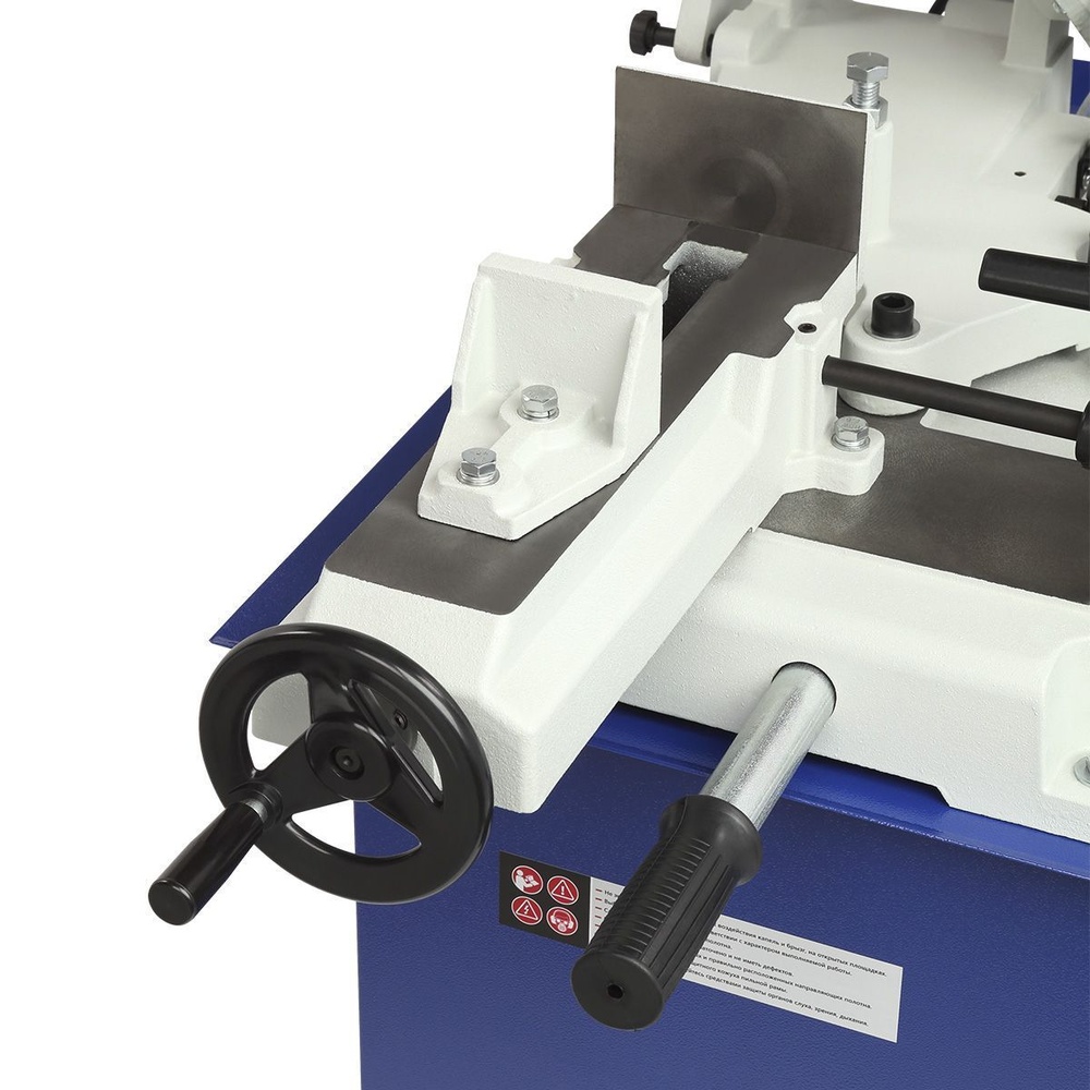 Жесткость и точность: Сочетание стального основания и чугунной рамы эффективно гасит вибрации. Направляющие полотна на подшипниках исключают его перекос.