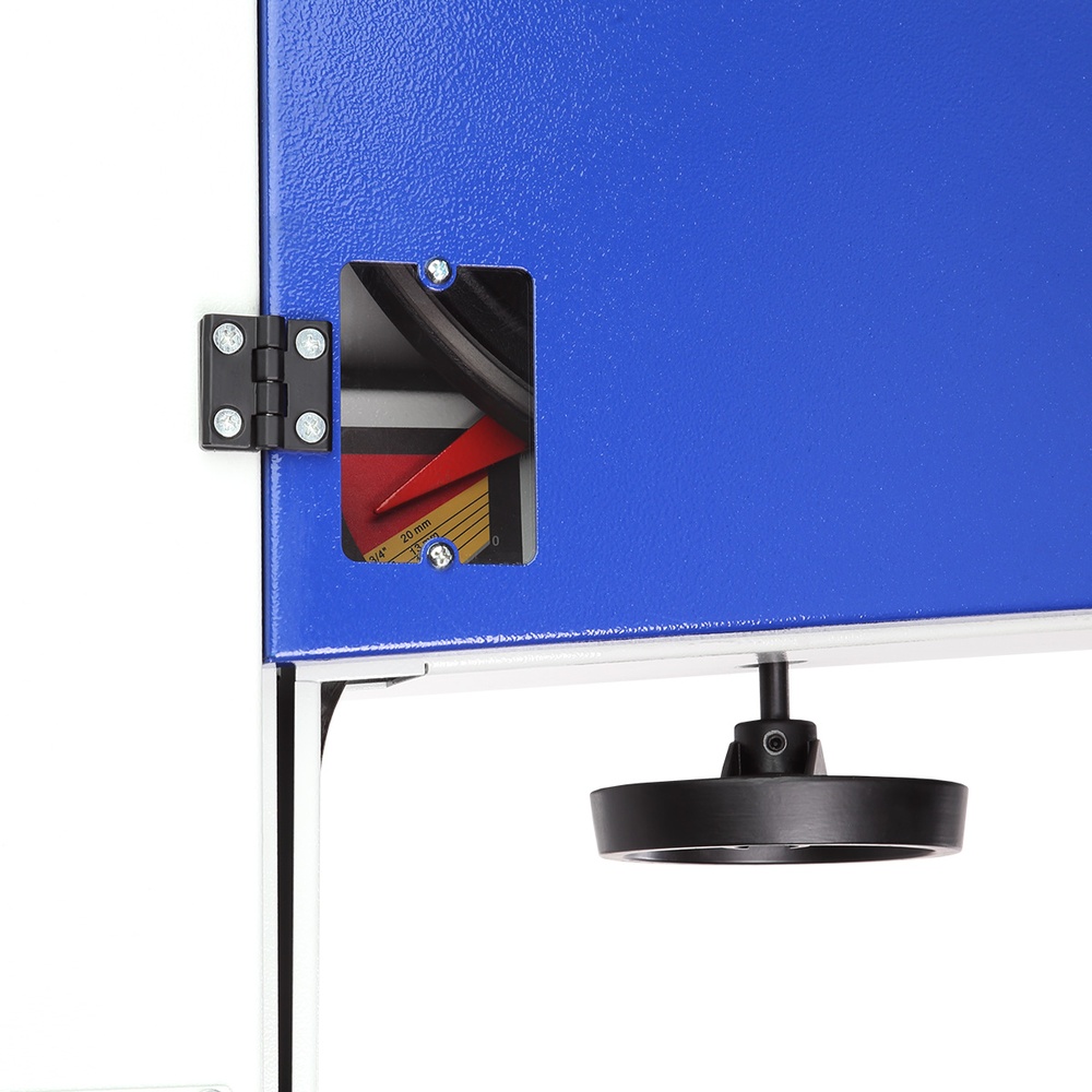 Точный рез обеспечивают несколько элементов: верхняя направляющая легко регулируется под толщину заготовки; тарельчатые опоры настраиваются, чтобы полотно не уводило в сторону; натяжение полотна отслеживается на индикаторе в смотровом окошке.