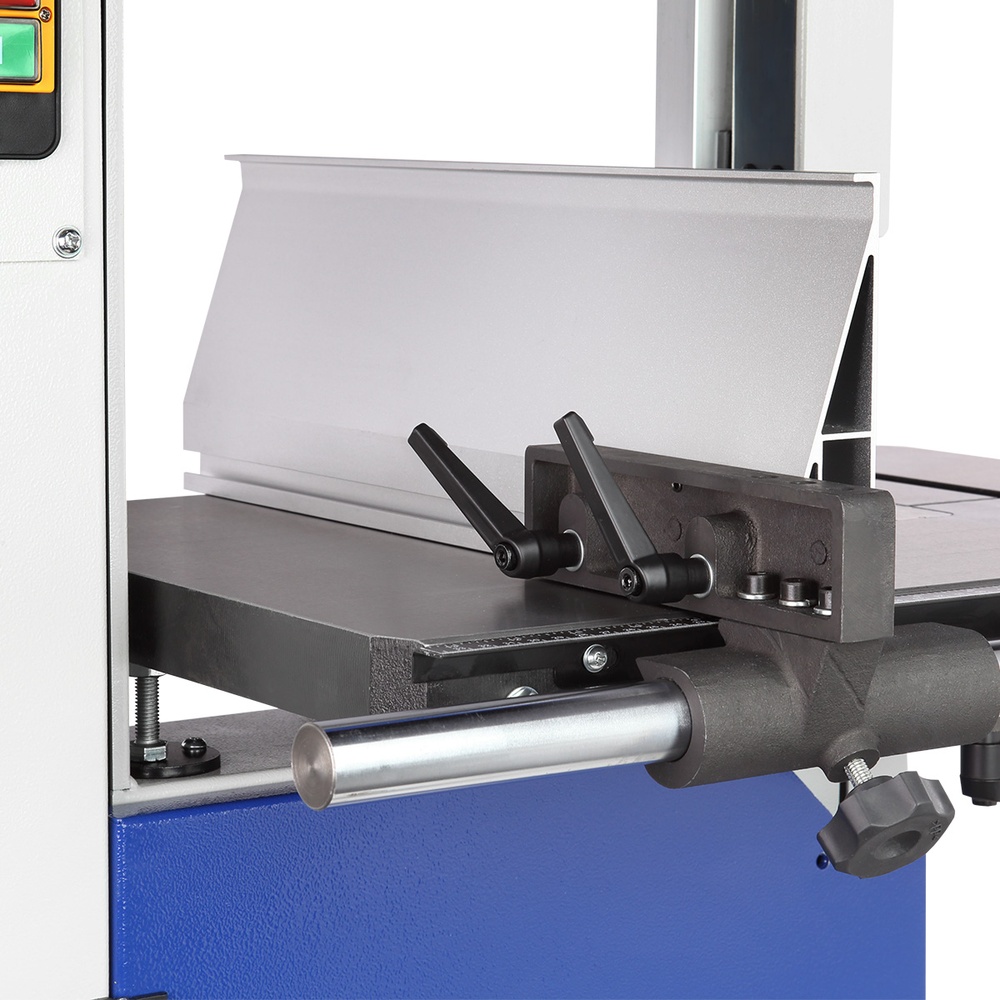Для позиционирования заготовок станок комплектуется двумя упорами. Массивный параллельный упор из алюминиевого профиля, который имеет два положения по высоте для работы с деталями разной толщины. А также угловым упором с диапазоном настройки от -90° до +90°, он позволяет выполнять как продольные, так и поперечные резы с высокой точностью.