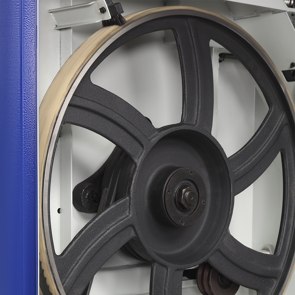 Визуальный контроль: Специальные окна позволяют следить за положением полотна на чугунных маховиках и уровнем его натяжения по индикатору.