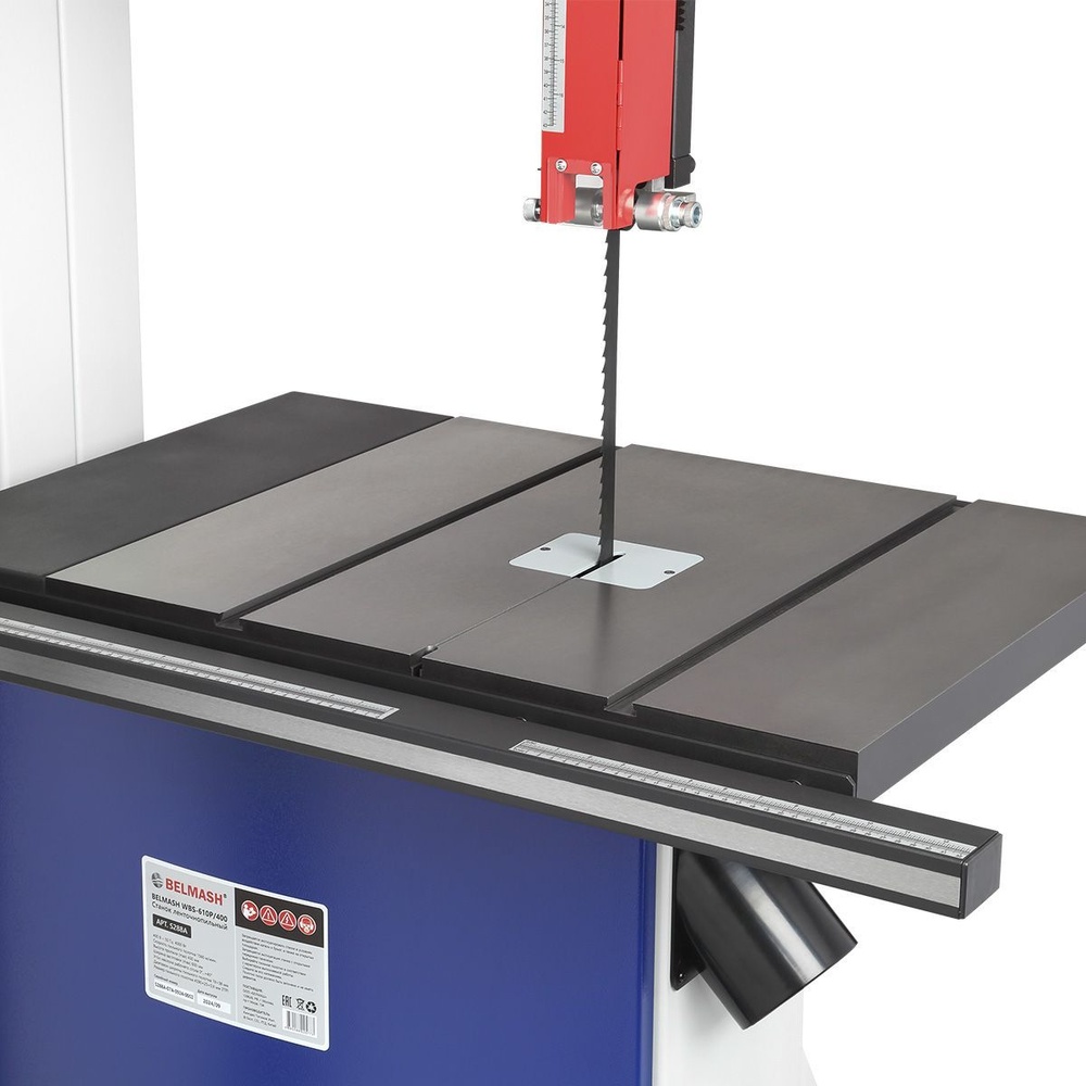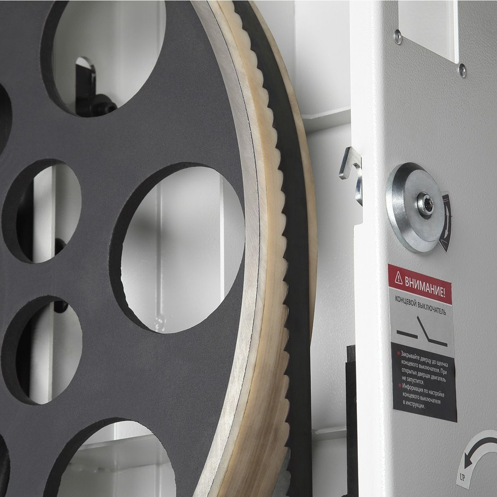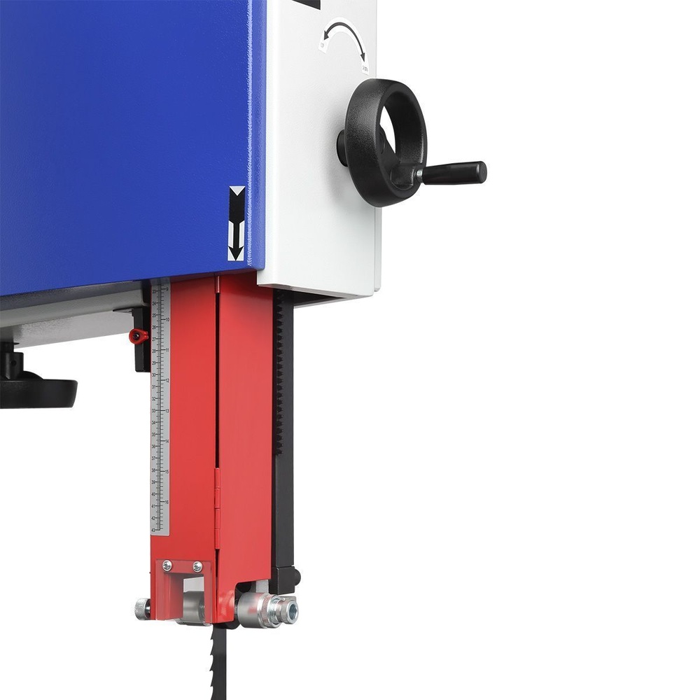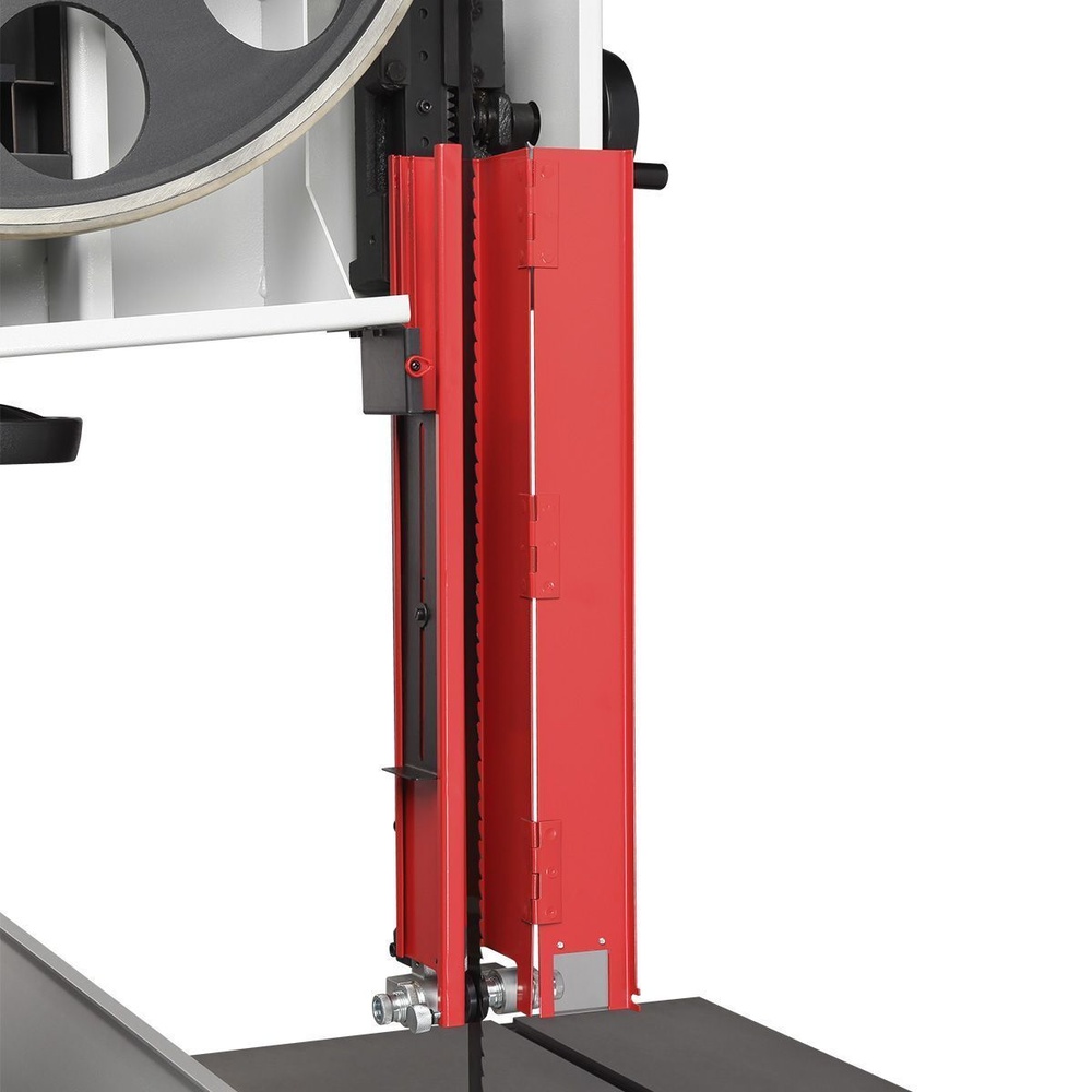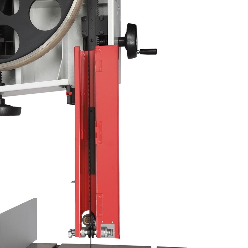 Качество и безопасность реза обеспечивает продуманная система направляющих пильного полотна. Верхний узел с маховиком быстро регулируется по высоте. Боковые опоры и задняя направляющая точно настраиваются для минимального зазора и исключения увода полотна. Натяжение контролируется по индикатору в смотровом окне.