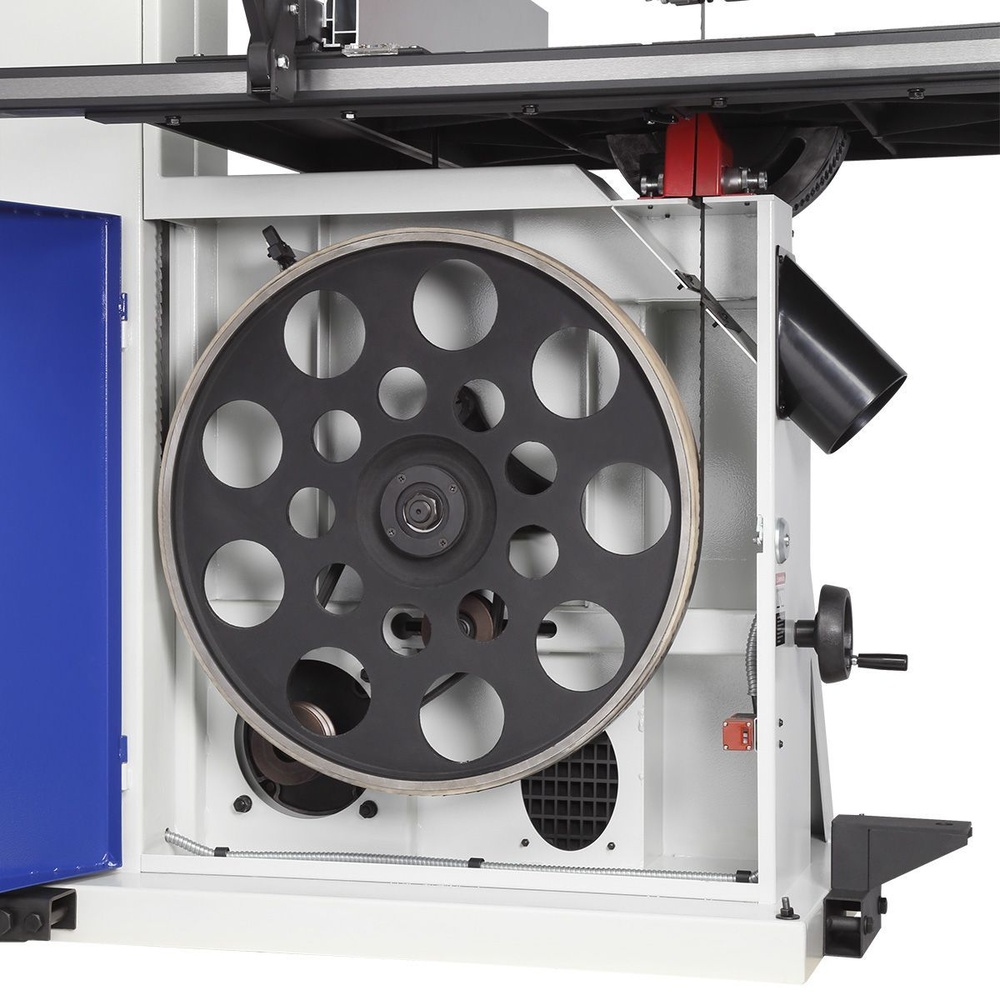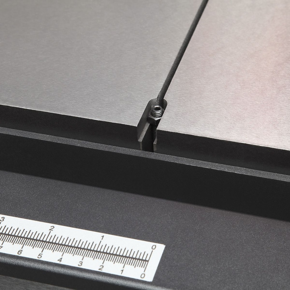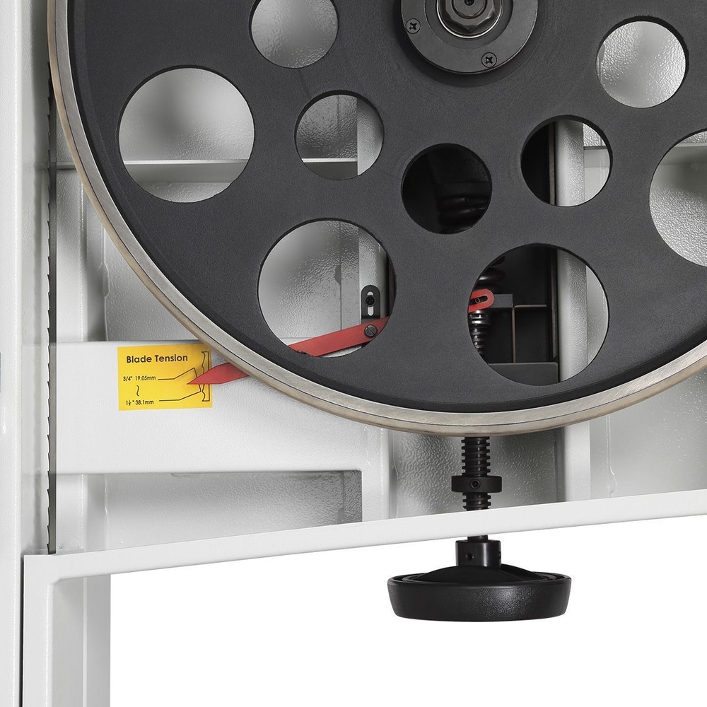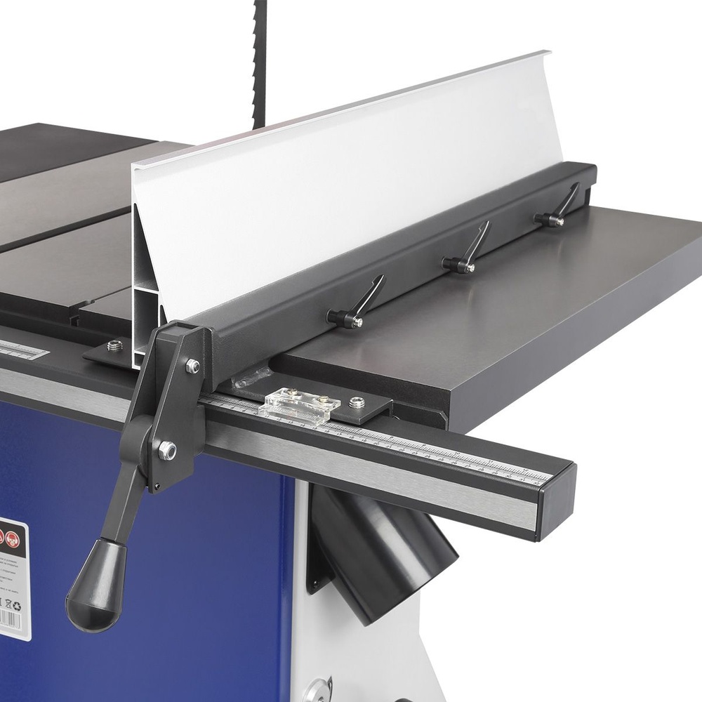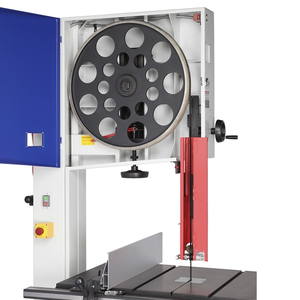 Качество и безопасность реза обеспечивает продуманная система направляющих пильного полотна. Верхний узел с маховиком быстро регулируется по высоте. Боковые опоры и задняя направляющая точно настраиваются для минимального зазора и исключения увода полотна. Натяжение контролируется по индикатору в смотровом окне.