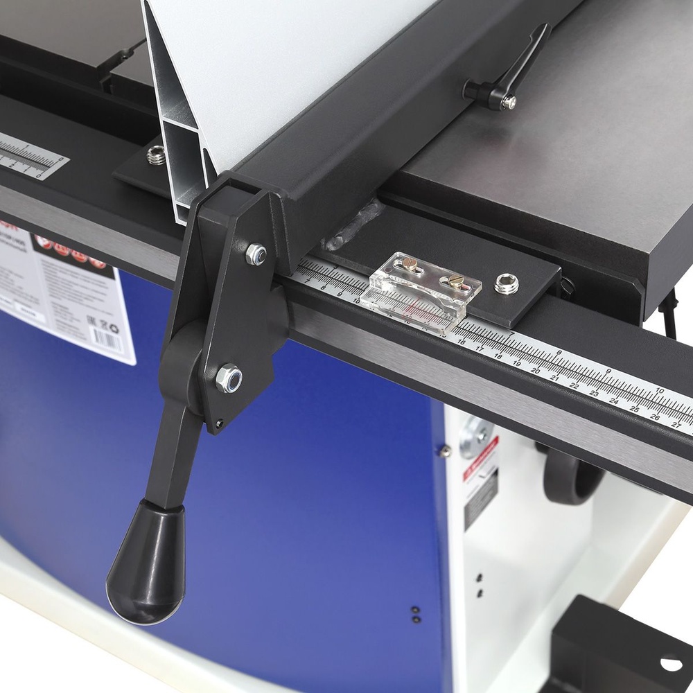 Для точного позиционирования заготовок станок комплектуется литым алюминиевым параллельным упором, который перемещается по передней направляющей и устанавливается как справа, так и слева от пильного полотна. Также он может устанавливаться как вертикально, так и горизонтально, в зависимости от высоты заготовки.