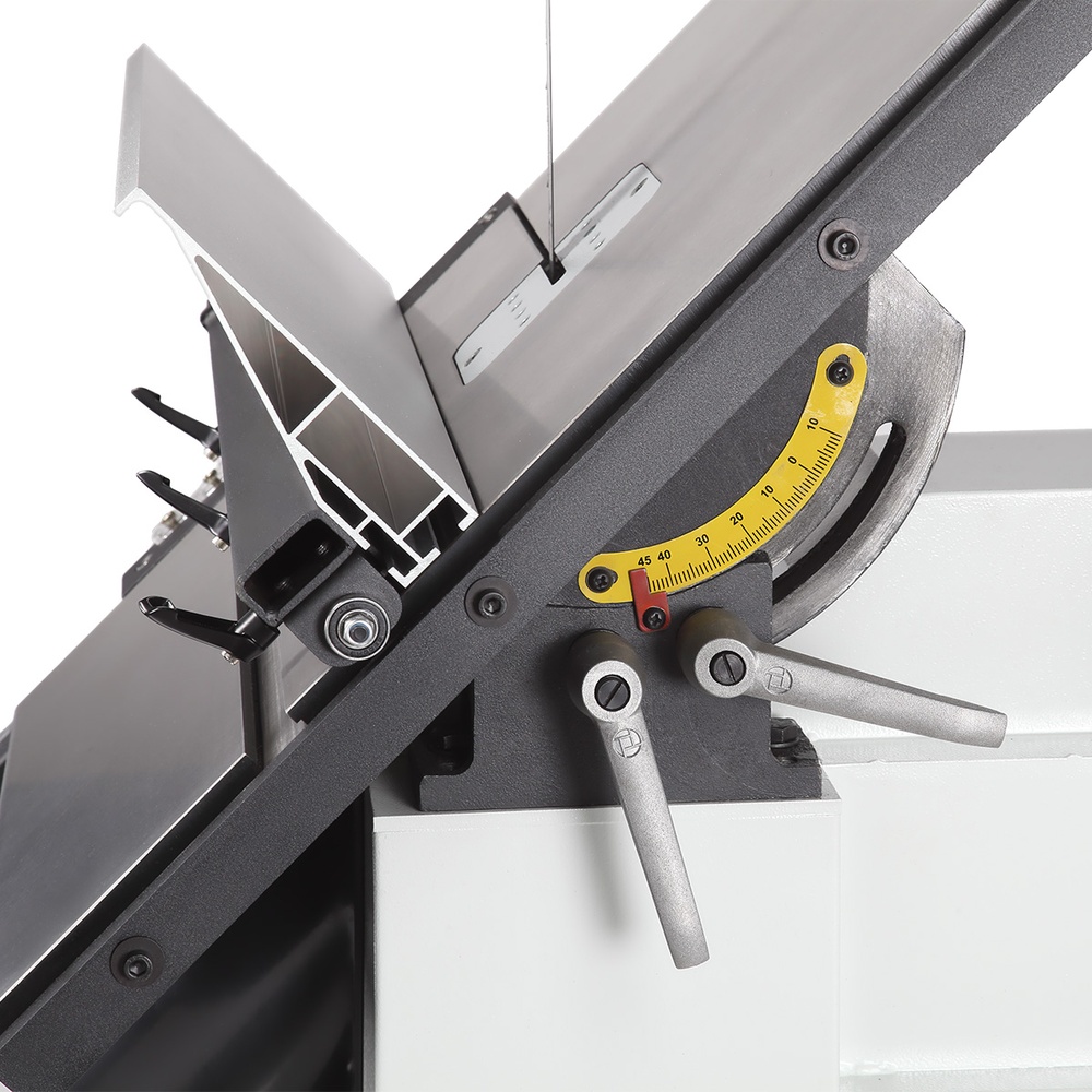 Для точного позиционирования заготовок станок комплектуется литым алюминиевым параллельным упором, который перемещается по передней направляющей и устанавливается как справа, так и слева от пильного полотна.