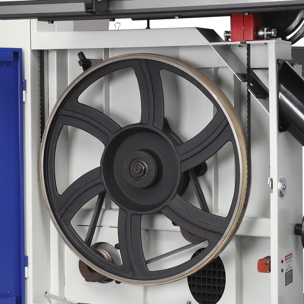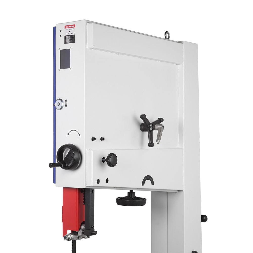 Качество и безопасность реза обеспечивает продуманная система направляющих пильного полотна. Верхний узел с маховиком быстро регулируется по высоте. Боковые опоры и задняя направляющая точно настраиваются шестигранными ключами для минимального зазора и исключения увода полотна. Натяжение контролируется по индикатору в смотровом окне.