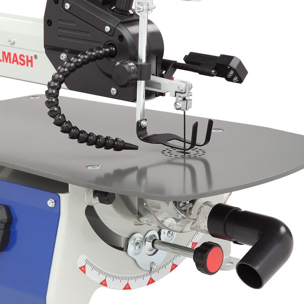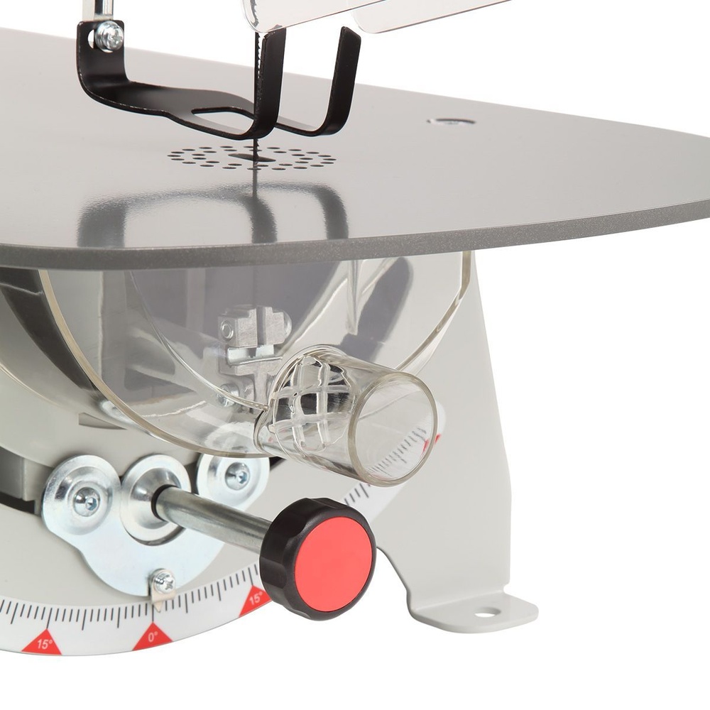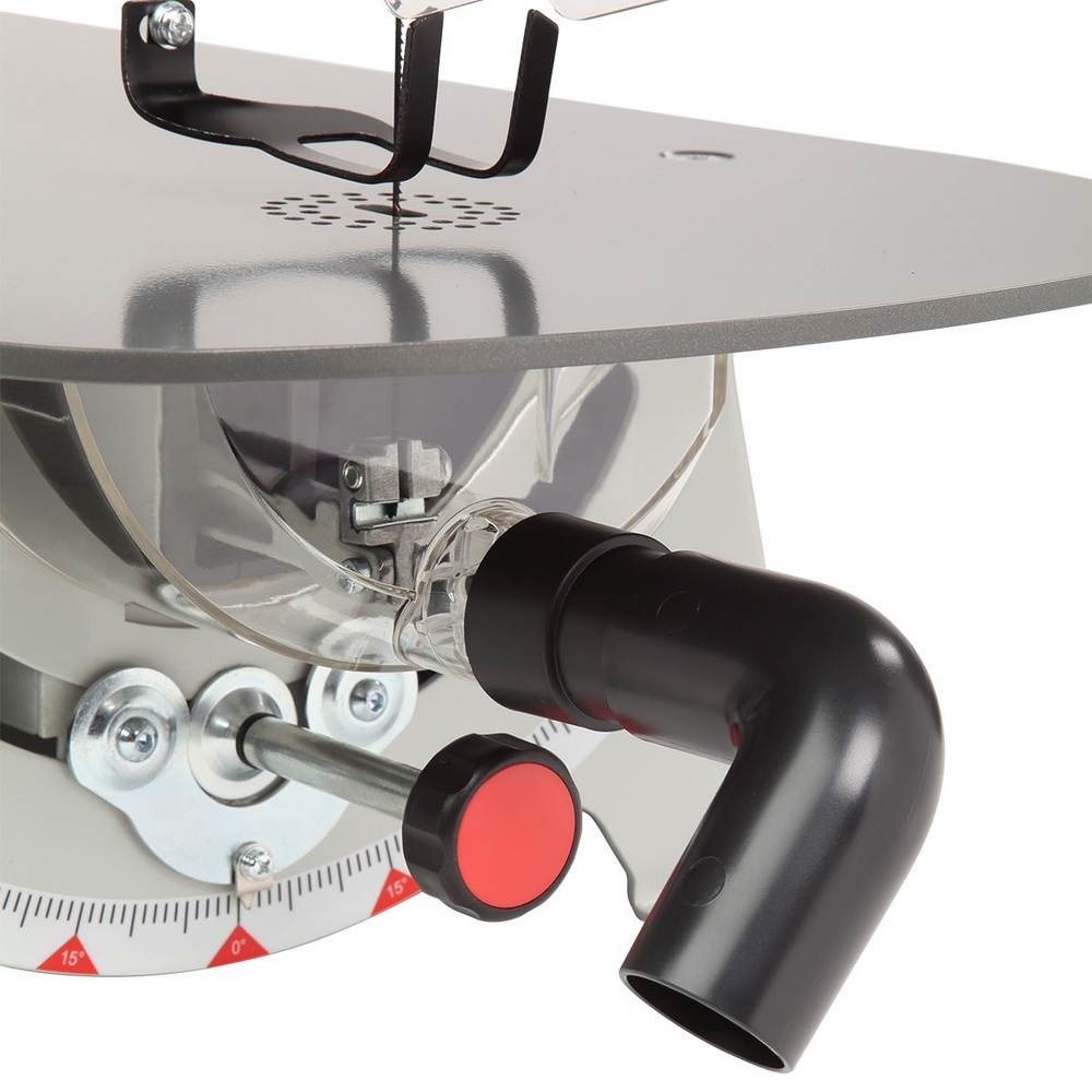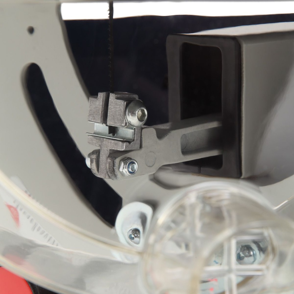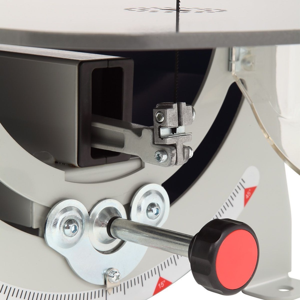 В отличие от классических лобзиковых станков, здесь реализован наклон режущего узла в диапазоне -45°...+45°. Неподвижный рабочий стол (541×349 мм) из углеродистой стали гарантирует стабильную опору для детали. Для удобства мастера предусмотрены быстрые фиксаторы на популярные углы: 0°, 22.5°, 30° и 45°.