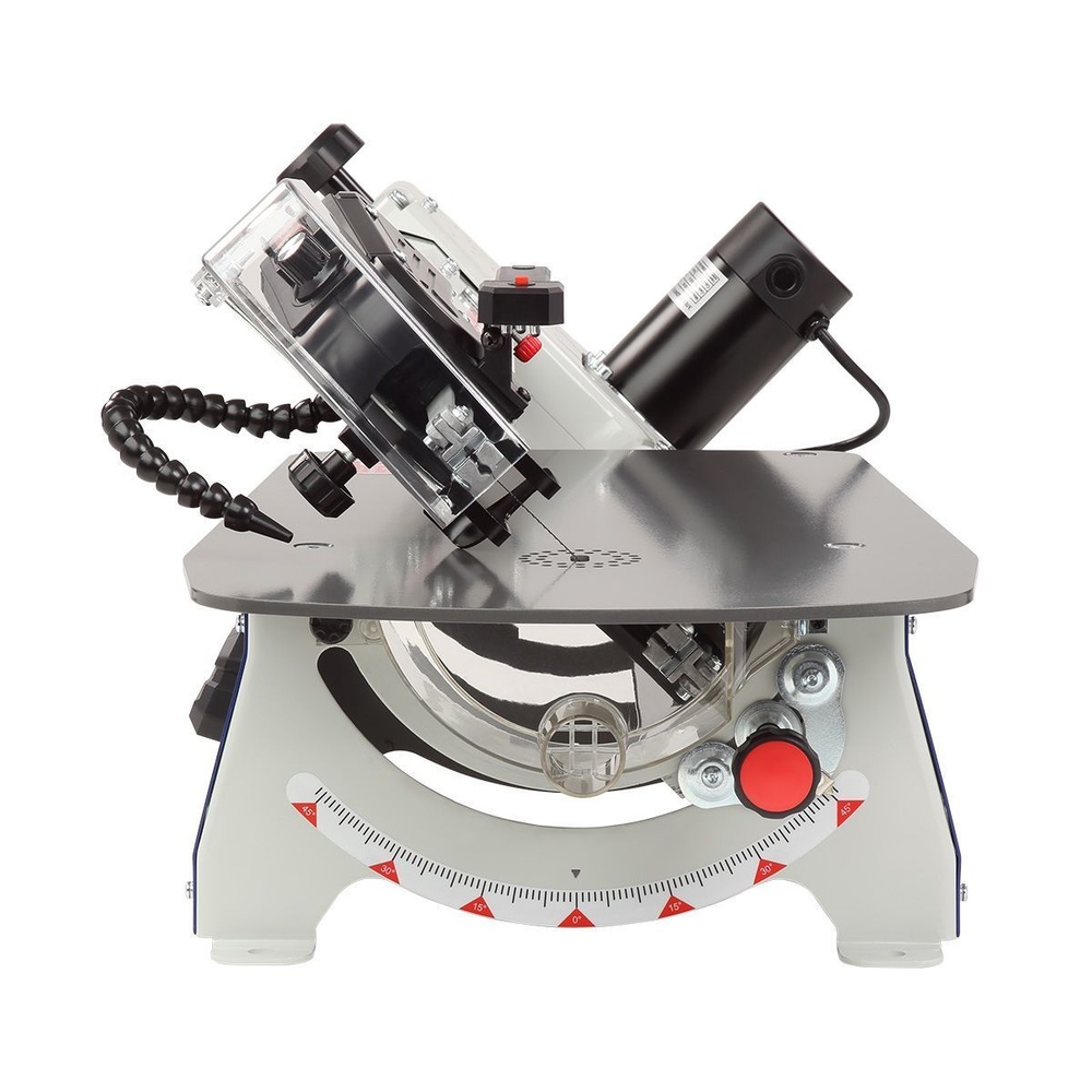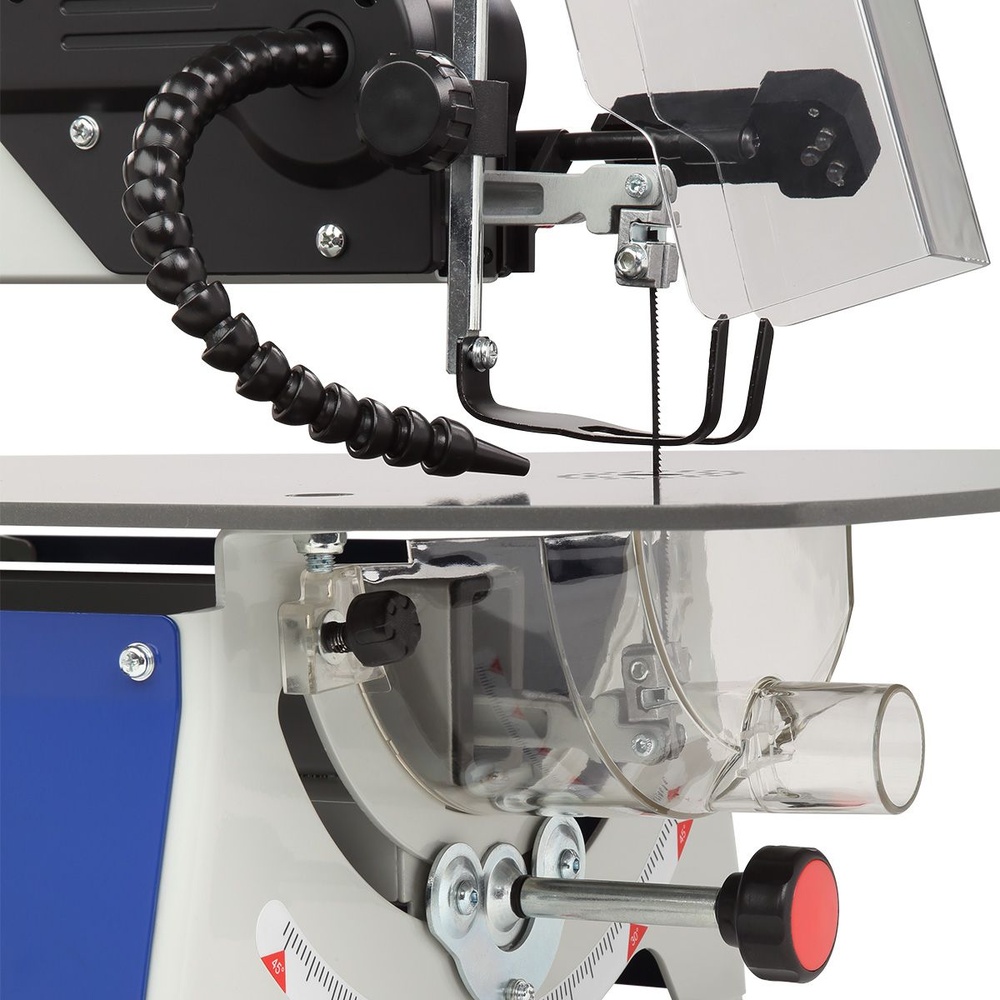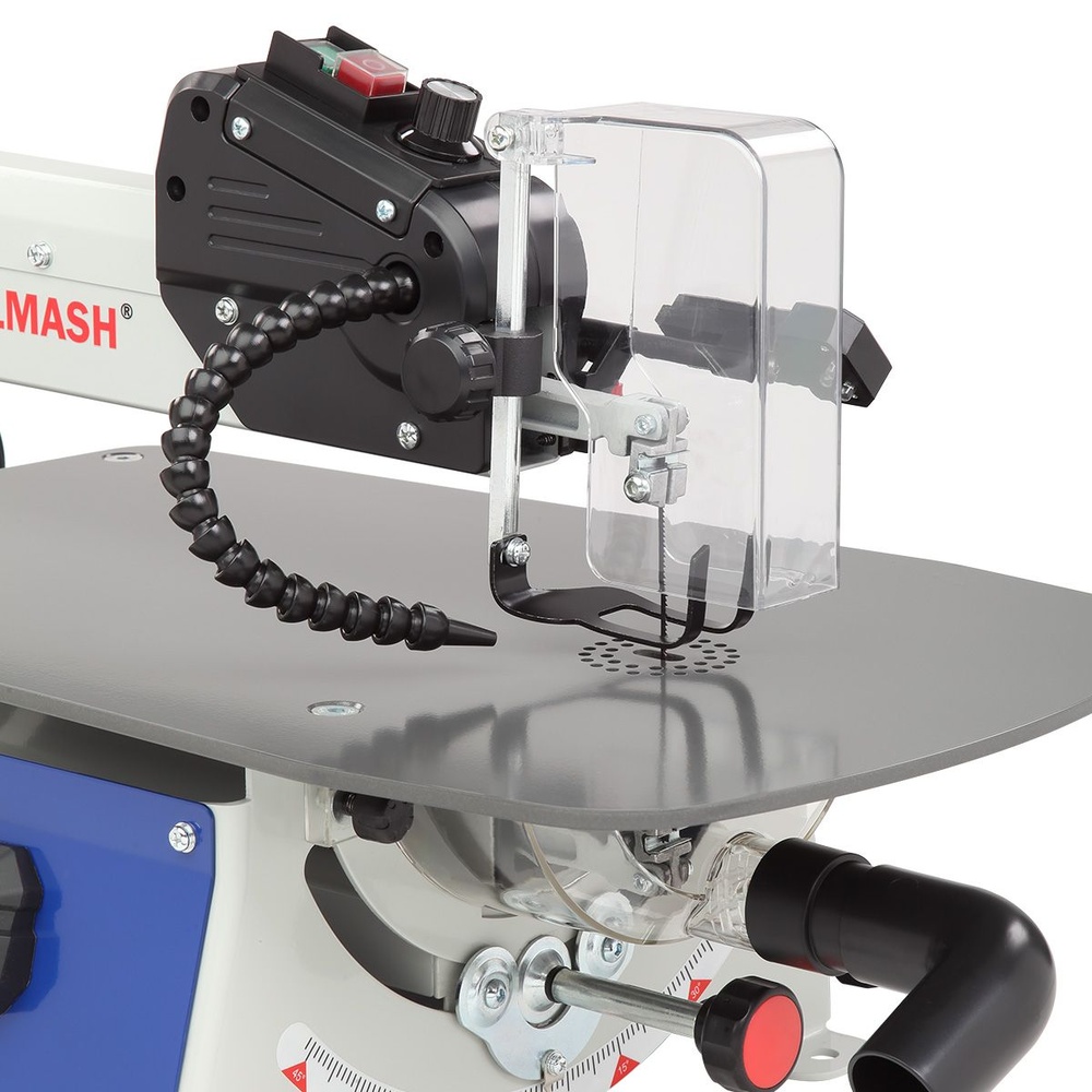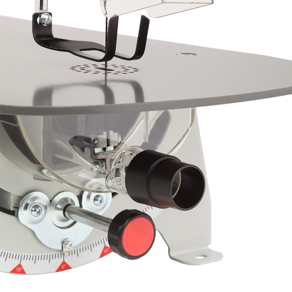 В отличие от классических лобзиковых станков, здесь реализован наклон режущего узла в диапазоне -45°...+45°. Неподвижный рабочий стол (541×349 мм) из углеродистой стали гарантирует стабильную опору для детали. Для удобства мастера предусмотрены быстрые фиксаторы на популярные углы: 0°, 22.5°, 30° и 45°.