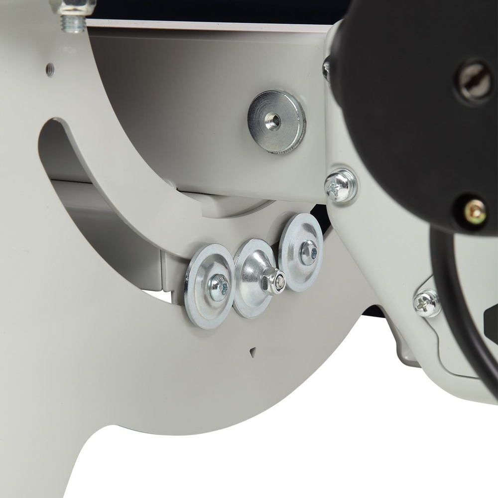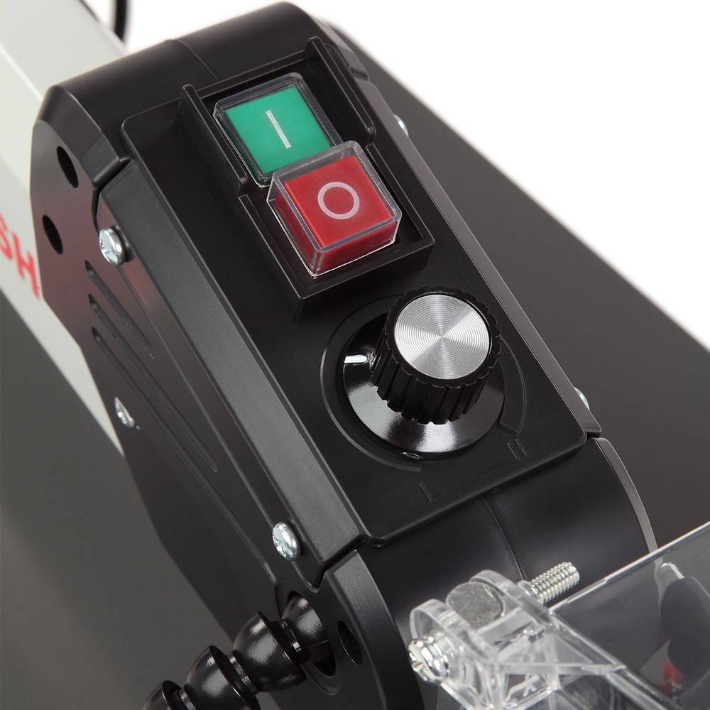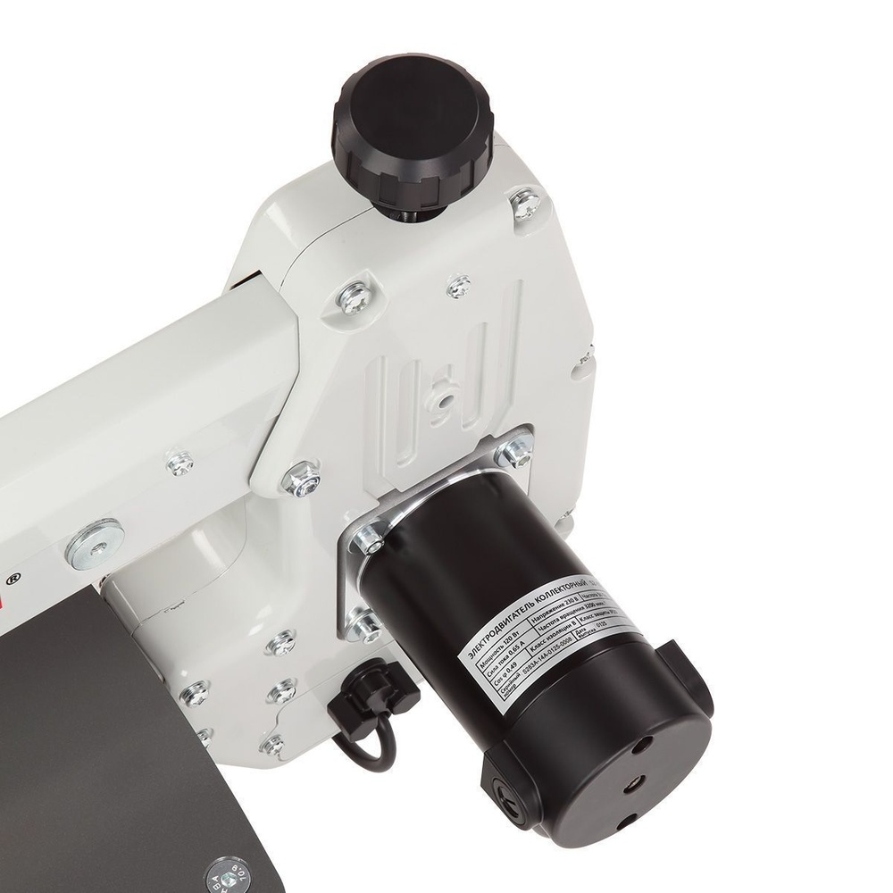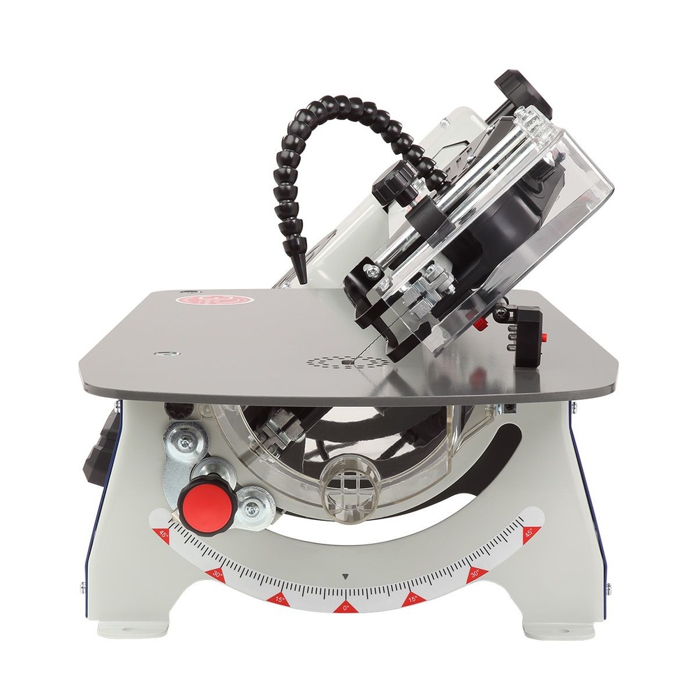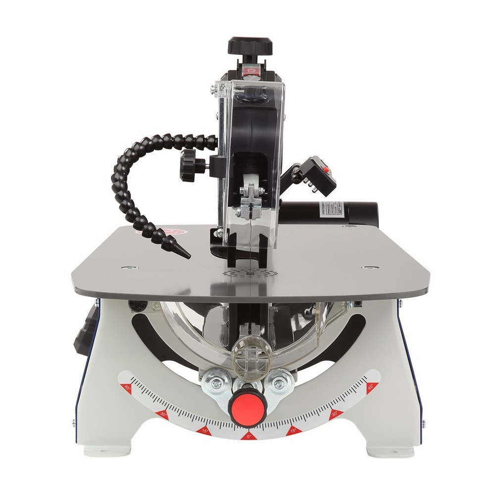 В отличие от классических лобзиковых станков, здесь реализован наклон режущего узла в диапазоне -45°...+45°. Неподвижный рабочий стол (541×349 мм) из углеродистой стали гарантирует стабильную опору для детали. Для удобства мастера предусмотрены быстрые фиксаторы на популярные углы: 0°, 22.5°, 30° и 45°.