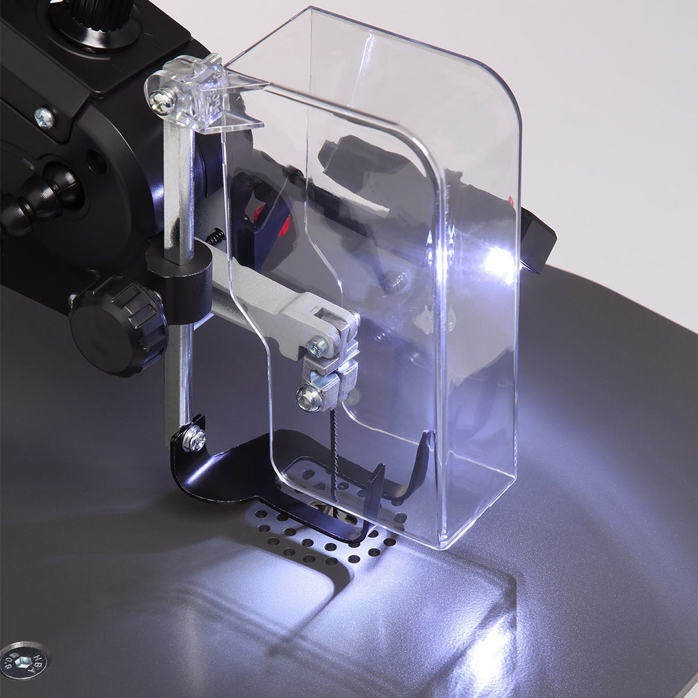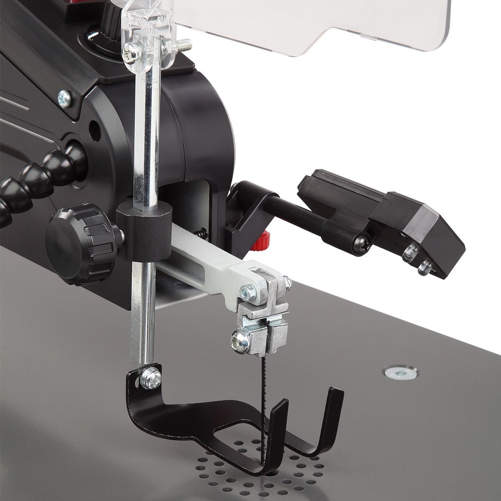 Станок поддерживает установку как штифтовых, так и бесштифтовых пилок. Это критически важно для мастеров, работающих с внутренними пропилами: тонкую бесштифтовую пилку легко продеть в минимальное технологическое отверстие для выполнения тончайшего внутреннего орнамента.