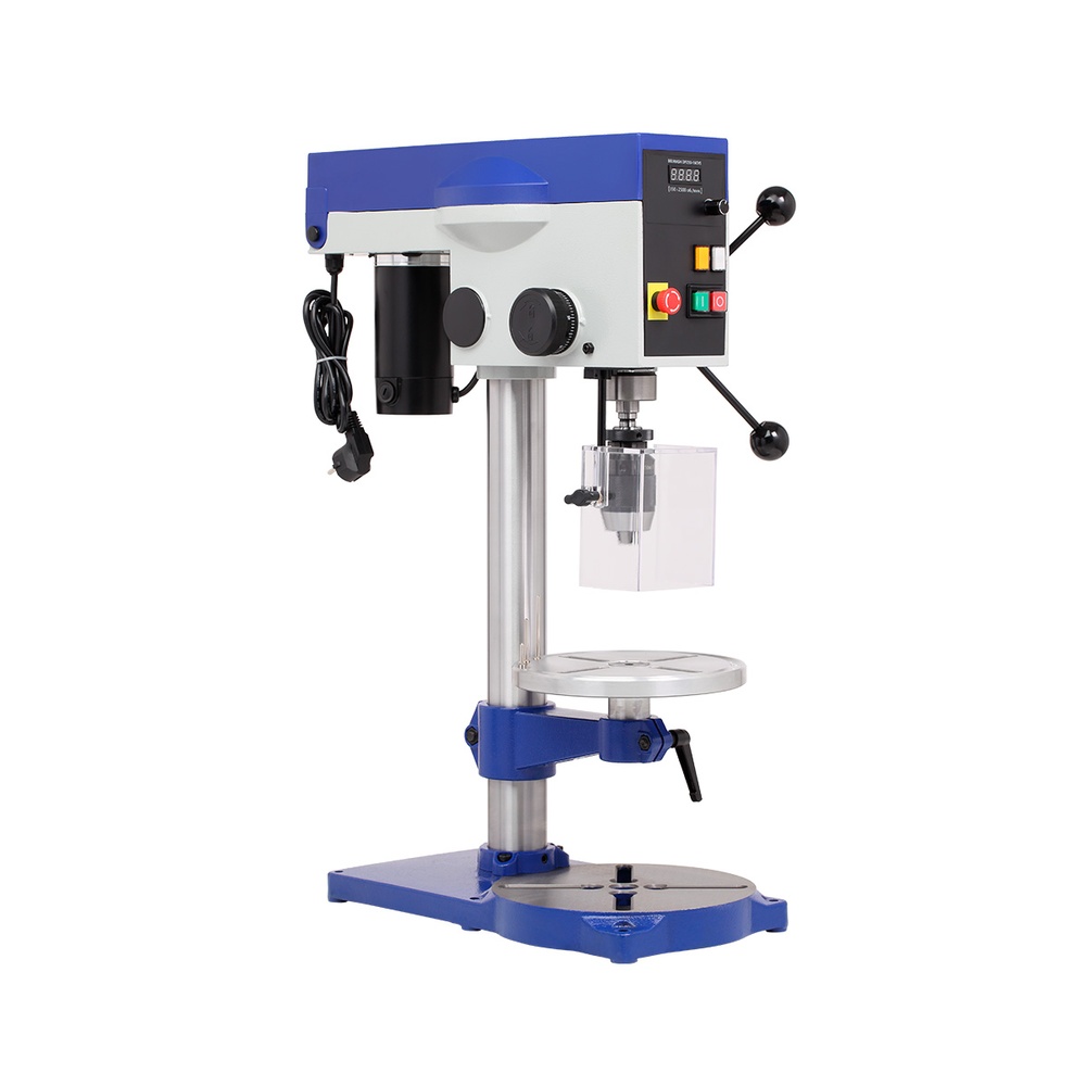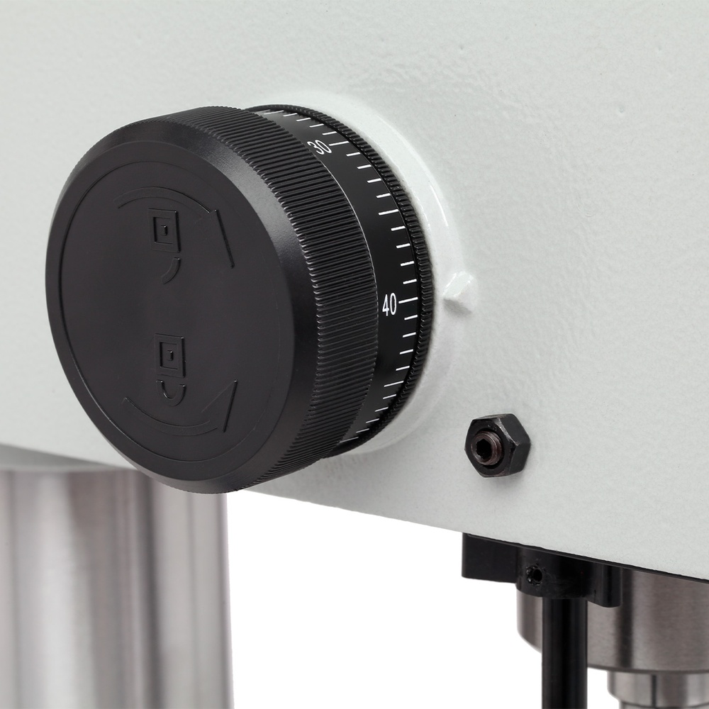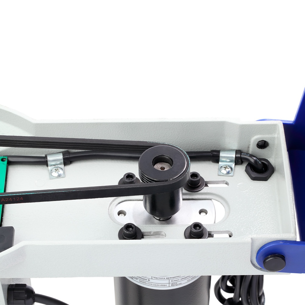 Станок оснащен надежным коллекторным двигателем мощностью 550 Вт. Ременная передача в связке с электронной системой контроля оборотов обеспечивает высокий крутящий момент на всем диапазоне скоростей. Это позволяет одинаково эффективно работать как тонкими сверлами на высоких оборотах, так и коронками большого диаметра на низких.