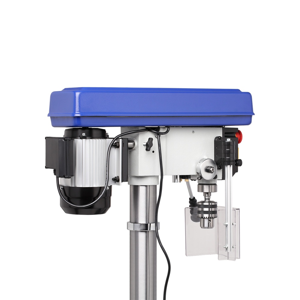 Сердце станка — надежный асинхронный двигатель мощностью 600 Вт. Ременная передача обеспечивает плавный крутящий момент. Переключение между 12 скоростными режимами осуществляется путем переброски ремня на шкивах, что позволяет подобрать оптимальные обороты под конкретный диаметр сверла и тип материала.