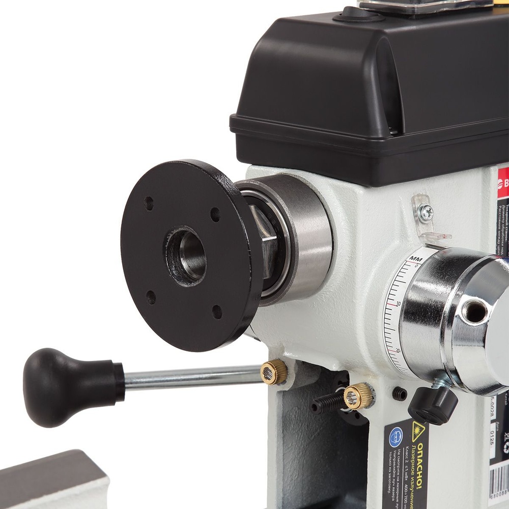 Станок оснащен надежным ременным вариатором. С помощью специальной рукоятки вы можете плавно изменять частоту вращения шпинделя в диапазоне от 450 до 2500 об/мин. Это дает возможность подобрать идеальный режим как для черновой обдирки крупных заготовок, так и для финишной полировки.