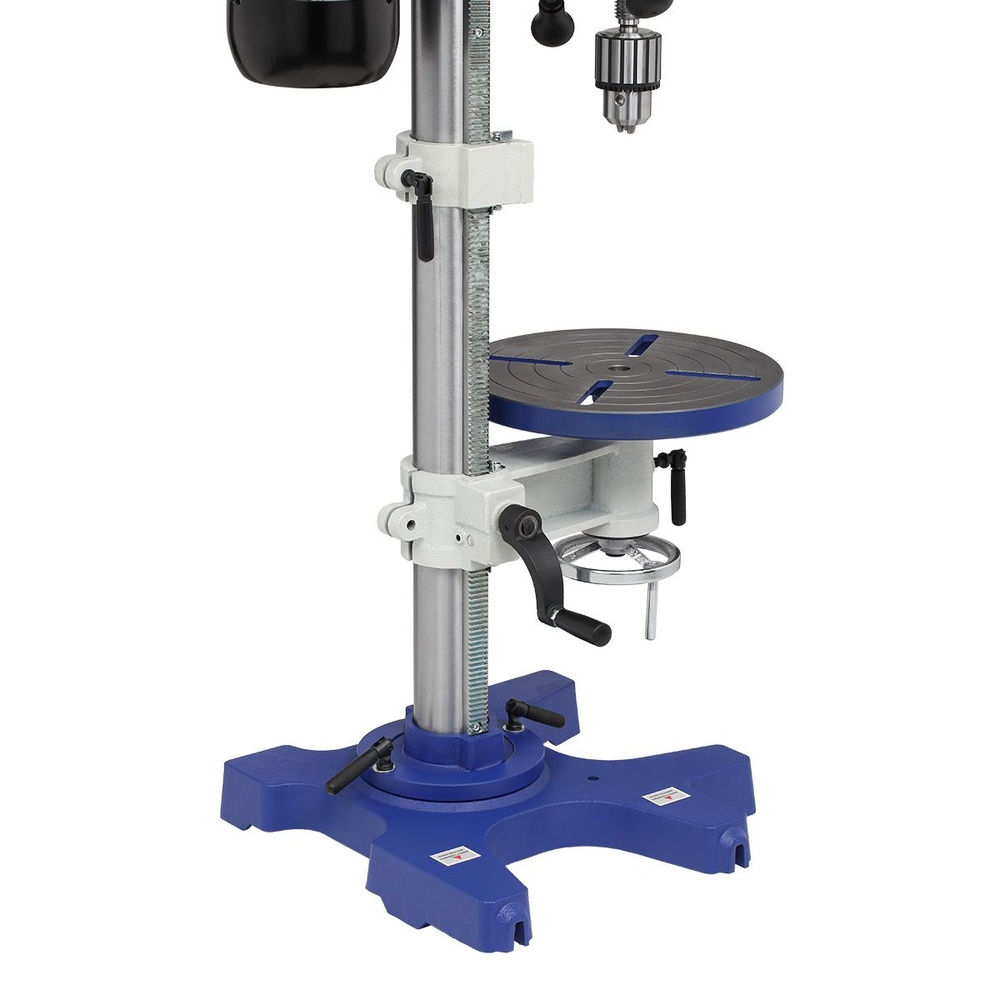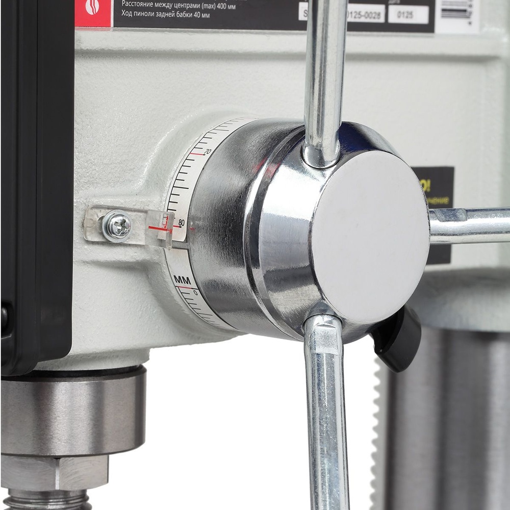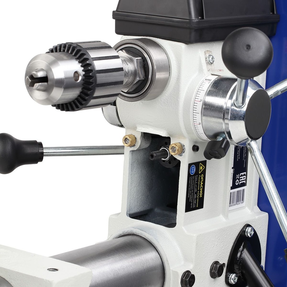 Основание, передняя и задняя бабки, подручник и рабочий стол изготовлены из высококачественного чугуна. Массивная конструкция эффективно гасит вибрации, обеспечивая чистоту обработки. Усиленная стальная колонна (Ø65 мм, стенка 6 мм) гарантирует отсутствие люфтов при сверлении под нагрузкой.