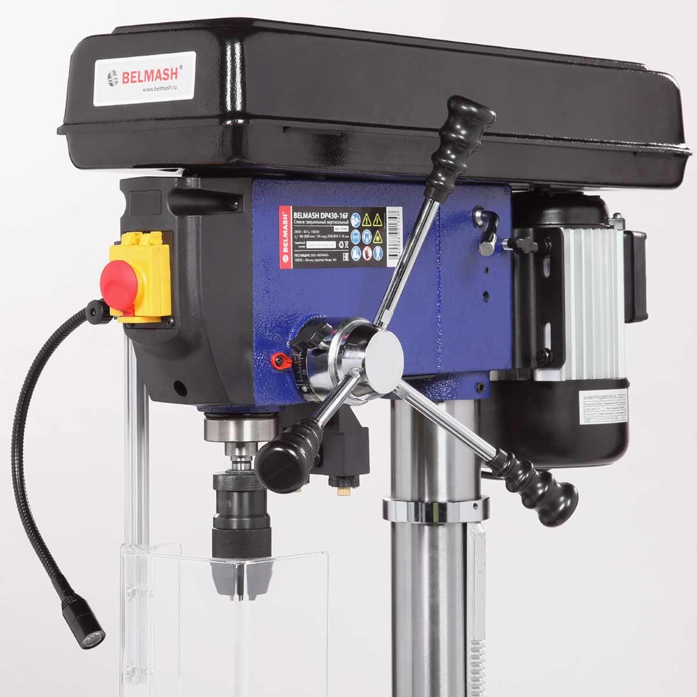 Высокая точность: Станок оснащен лазерным указателем оси сверления и яркой подсветкой рабочей зоны. Ход пиноли 80 мм контролируется эргономичной тройной рукоятью.