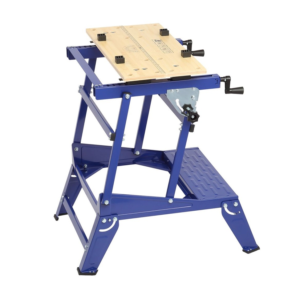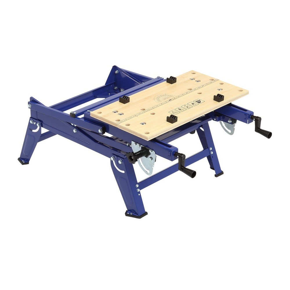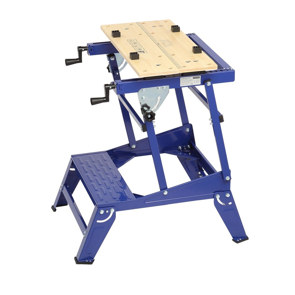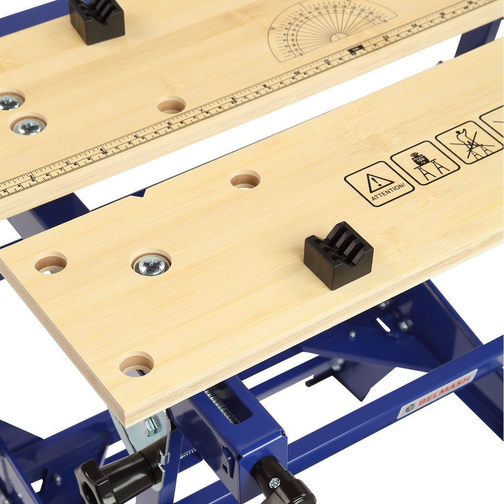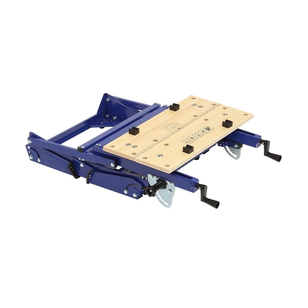 Верстак оснащен подвижными зажимами и отверстиями для струбцин, для надежной фиксации заготовки. Ширину столешницы можно легко изменить с помощью быстроразъемного механизма (ход — 170 мм).