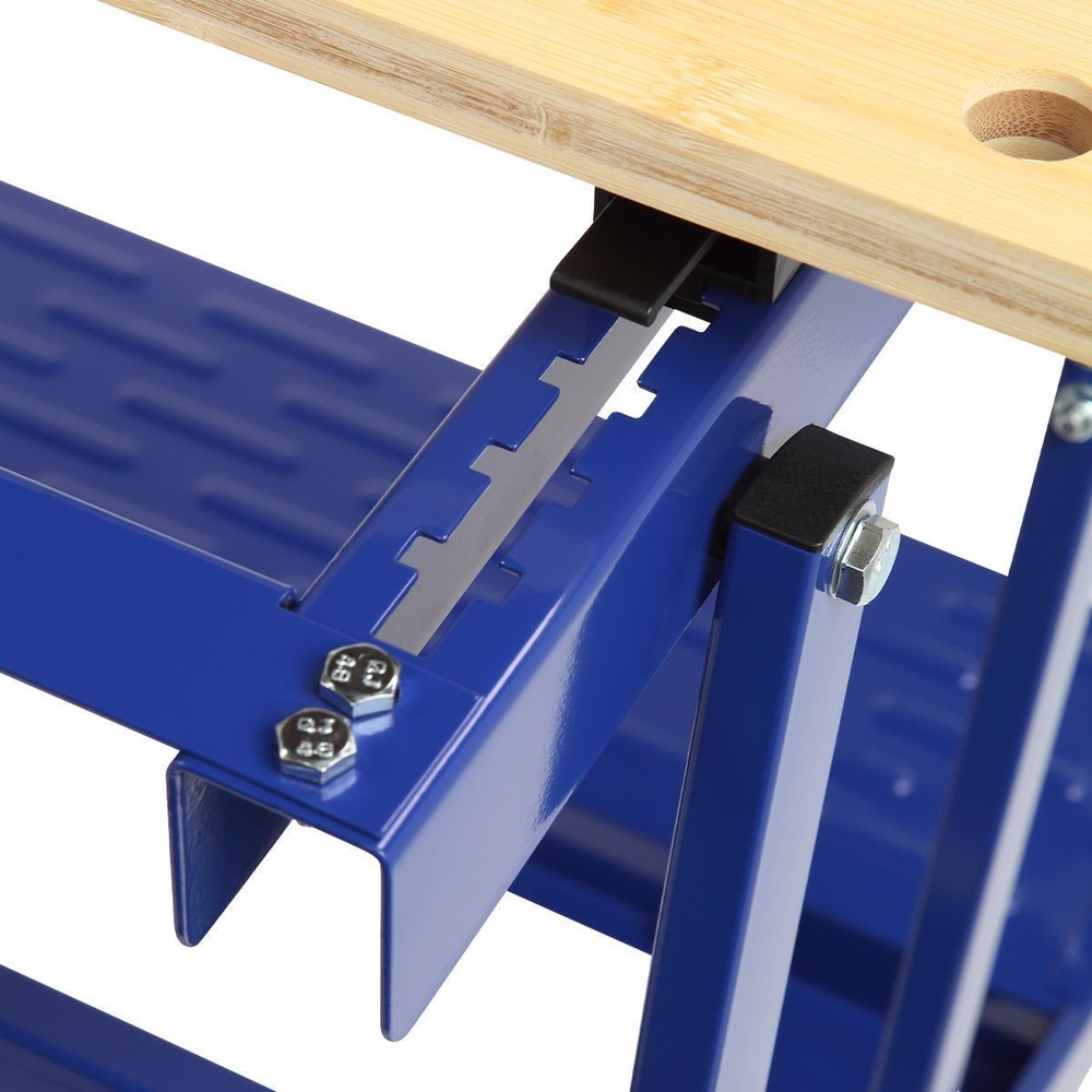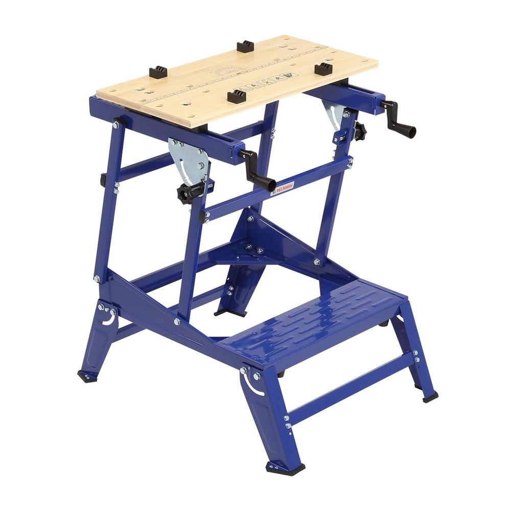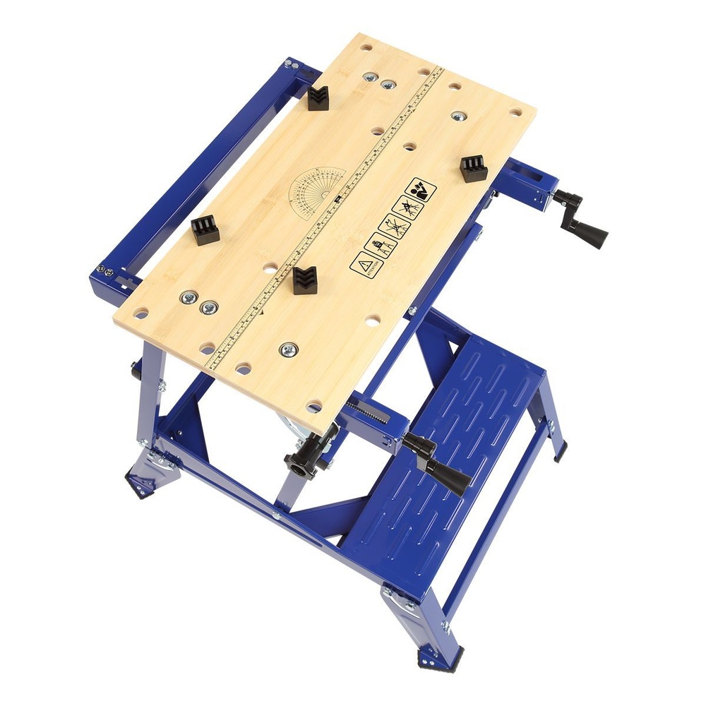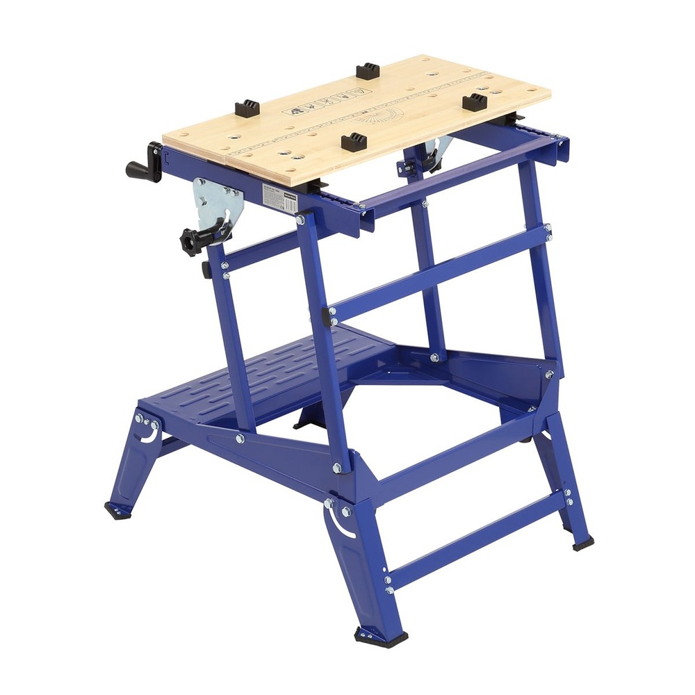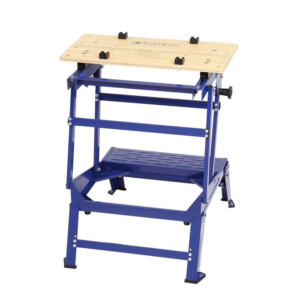 Верстак оснащен подвижными зажимами и отверстиями для струбцин, для надежной фиксации заготовки. Ширину столешницы можно легко изменить с помощью быстроразъемного механизма (ход — 170 мм).