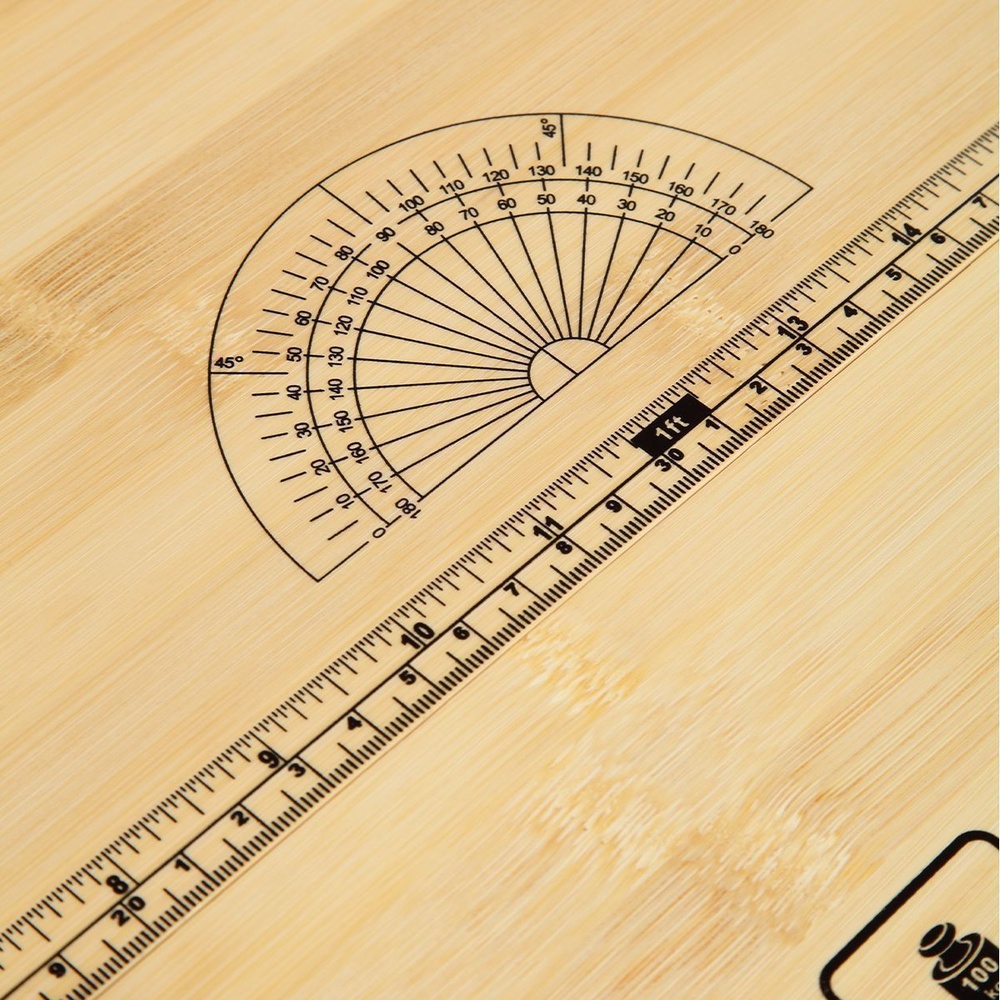 Столешница сделана из прочного бамбука и уже содержит всё для разметки. На нее нанесены мерная линейка (0-605 мм) и транспортир (0-180°). Это избавляет от необходимости искать инструменты и гарантирует идеальную точность.