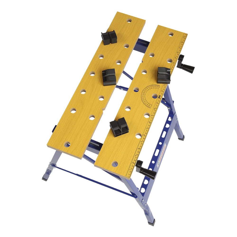 Верстак комплектуется набором переставных пластиковых губок (упоров). Множество технологических отверстий в столешнице позволяют устанавливать упоры в различных конфигурациях, надежно зажимая предметы круглой, квадратной или неправильной формы.
